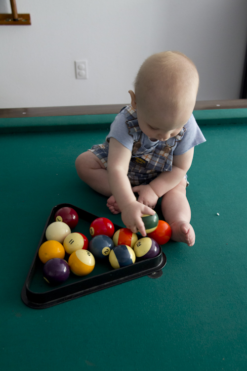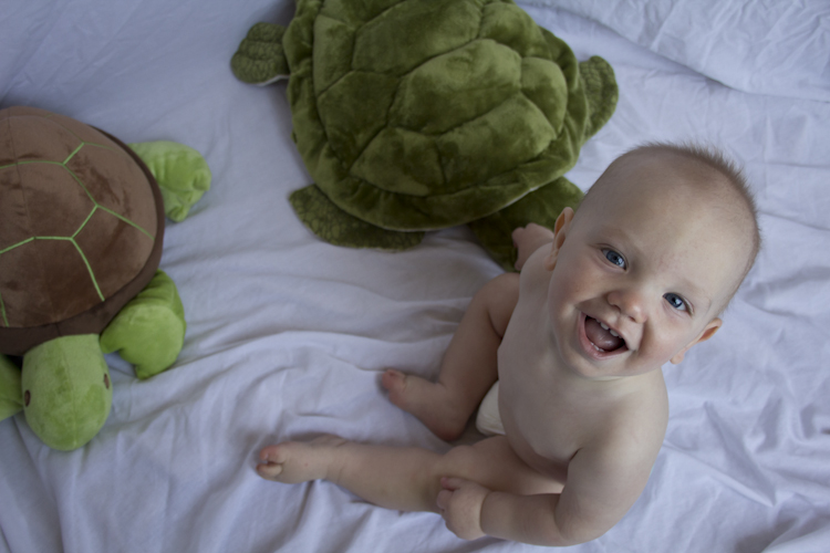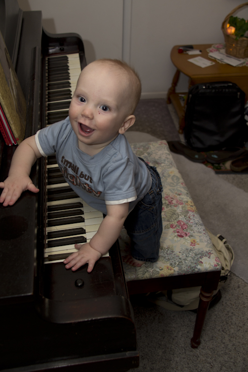 You’re cruising, climbing, and working on your physical skills. From stacking blocks, to putting things inside other things, you’re starting to do more than just pick things up. You can put the colored blocks into the right slots on your toys, and nest different sizes. It’s a joy to watch you learn. You pick out the moon each time we’re outside at night, and you’re pointing to everything. It’s most often a directive that means “take me there” or “help?”. You can sign More, Eat, and Thank You, but refuse to sign Please. It’s much easier just to point. You can climb, and you’re starting to jump now. All you need is Daddy’s leg, or possibly Addy to climb up onto the couch. You’re jumping when you’re standing against something, be it the gate or the side of the crib. Walk away, come back, and you’ve climbed up onto the kid’s picnic table. Walk away, come back, and you’re standing on the file box in the office looking to climb up the bookshelf. It’s nothing if not keeping us on our toes.