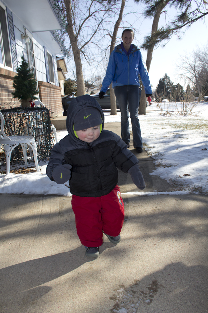 Adventures abound this month. After just two trips, you figured the path from Nana’s house to the park, and decided one day when we went out to play in the snow that you were going to take yourself to the park. You set off down the street, started to cross at the right intersection, and walked the 1/3rd of the mile or so to the park all by yourself. The same day, you climbed up and slid down the big tube slide all by yourself. I wonder how it looks from down there. As you get more coordinated and taller, does the world look smaller?
