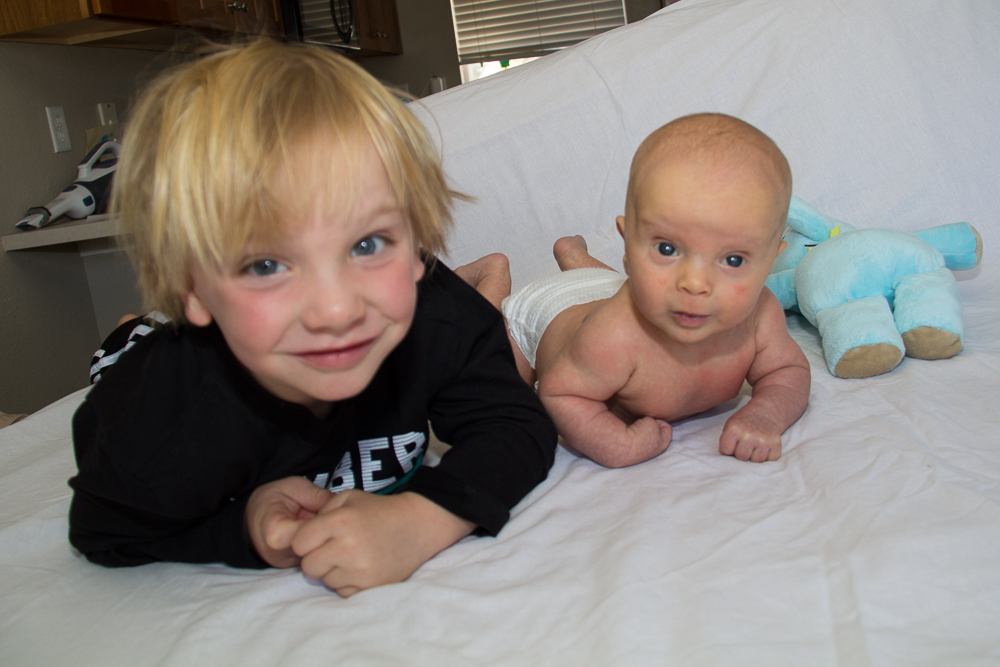 8 short weeks has you going from a tiny little bundle to a smiling little baby playing with his toys on the playmat, anxious to get moving. Even at 6 weeks, you’re scooting yourself with your feet on the ground. You coo, wiggle and kick the toys on the playmat. Oh, but we will soon be fondly remembering this time when you’ll still more or less stay where we leave you. You got to help Seth celebrate his fourth birthday, and he’ll be happy to help you celebrate yours, too!