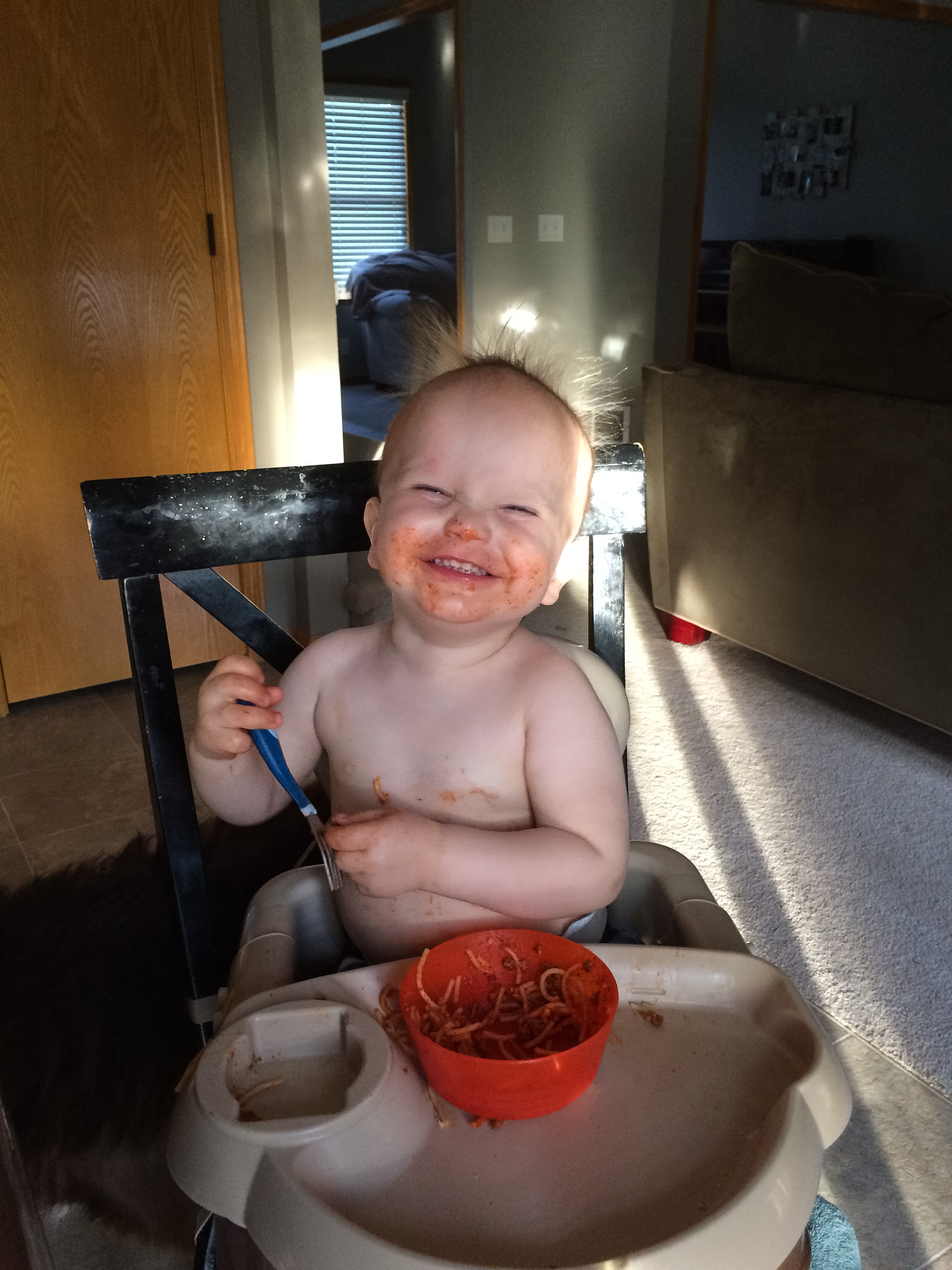 Clothes and shoes are providing hours of fascination this month. You figured out how to take your shirt off, though putting it on still requires a little help. Any time we even mention the word “yogurt”, and you want to eat some, you immediately set about trying to take off your shirt, no matter where you are. That’s in keeping with the general approach, though. Your spoon-work is improving, but not yet that skillful, and it generally degrades to use of hands, fingers, and painting with the yogurt still, so shirtless eating is often advised.