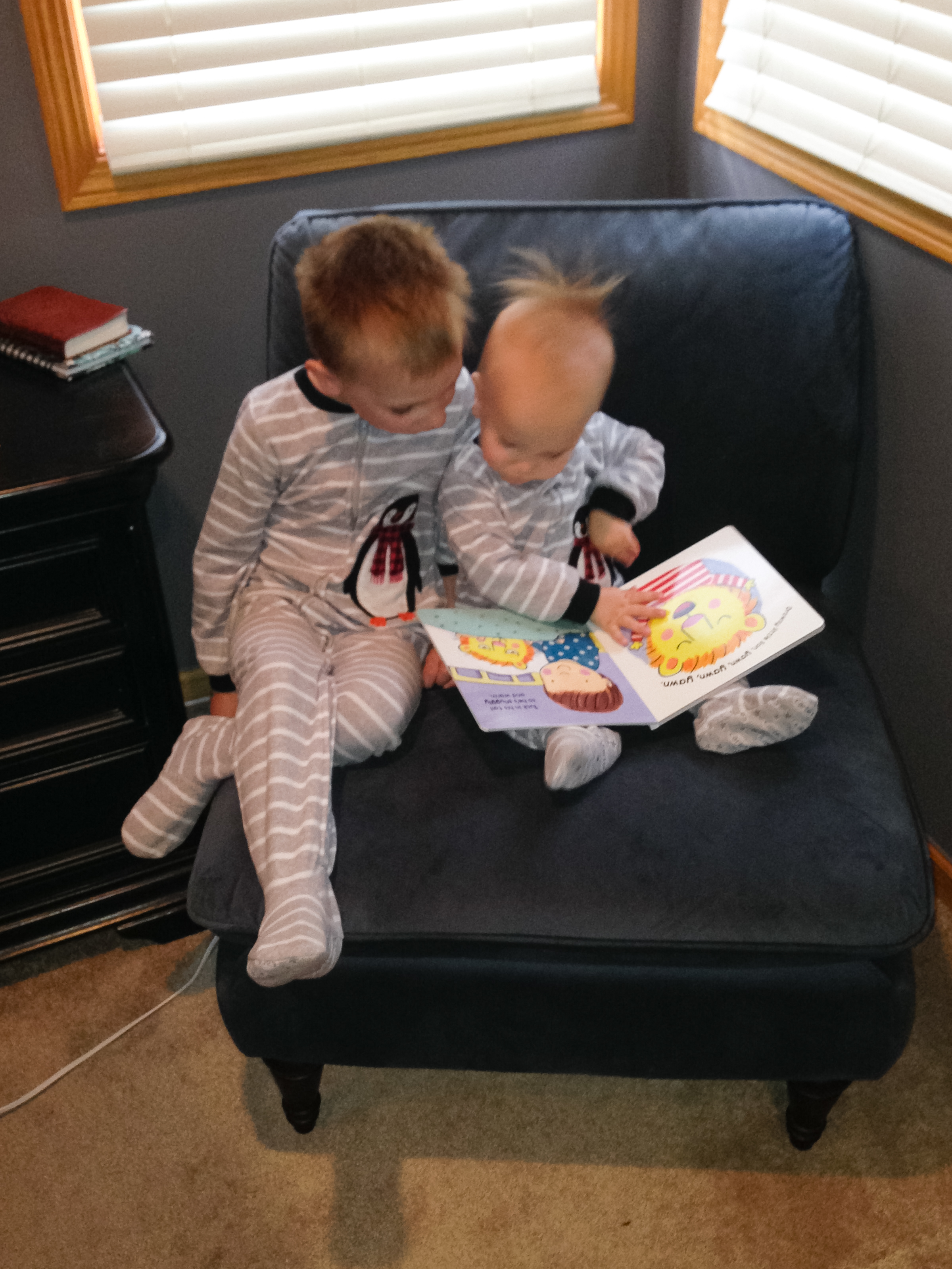 And now it’s time to say goodnight, with your little bedtime routine. You like it so much that you even head for the stairs on your own if you’re tired enough. One thing you can’t miss is brushing your teeth now. Of course, you’re happy to try to do that with any toothbrush you can get ahold of. That normally means your brother’s since it’s pretty much always out on the counter in the hall bathroom. You and Seth share a love for playing the bathtub, and you’ll go charging upstairs right after him when one of us offer bath time. The two of you generally even get along in the tub with the toys. Bedtime pretty much always finishes with snuggles as we read books and you hold your wubbies (def: a pacifier attached to a small stuffed animal. They’re just for going to sleep, and yes, it’s going to be a challenge to eventually take them away. Still, you know they’re only for sleeping, and happily drop them into the crib when you get up in the morning or from nap). You still reserve a special laugh for when you see either your dog or your dinosaur wubbie, even though the dinosaur has lost his pacifier. Nights you don’t want to go to sleep have brought pitching practice with the wubbies, though, and you’ve gotten good enough to get them across the room as far as the rocking chair. We won’t come back in too many times to give them back, though, so you’ll end up called out on strikes.