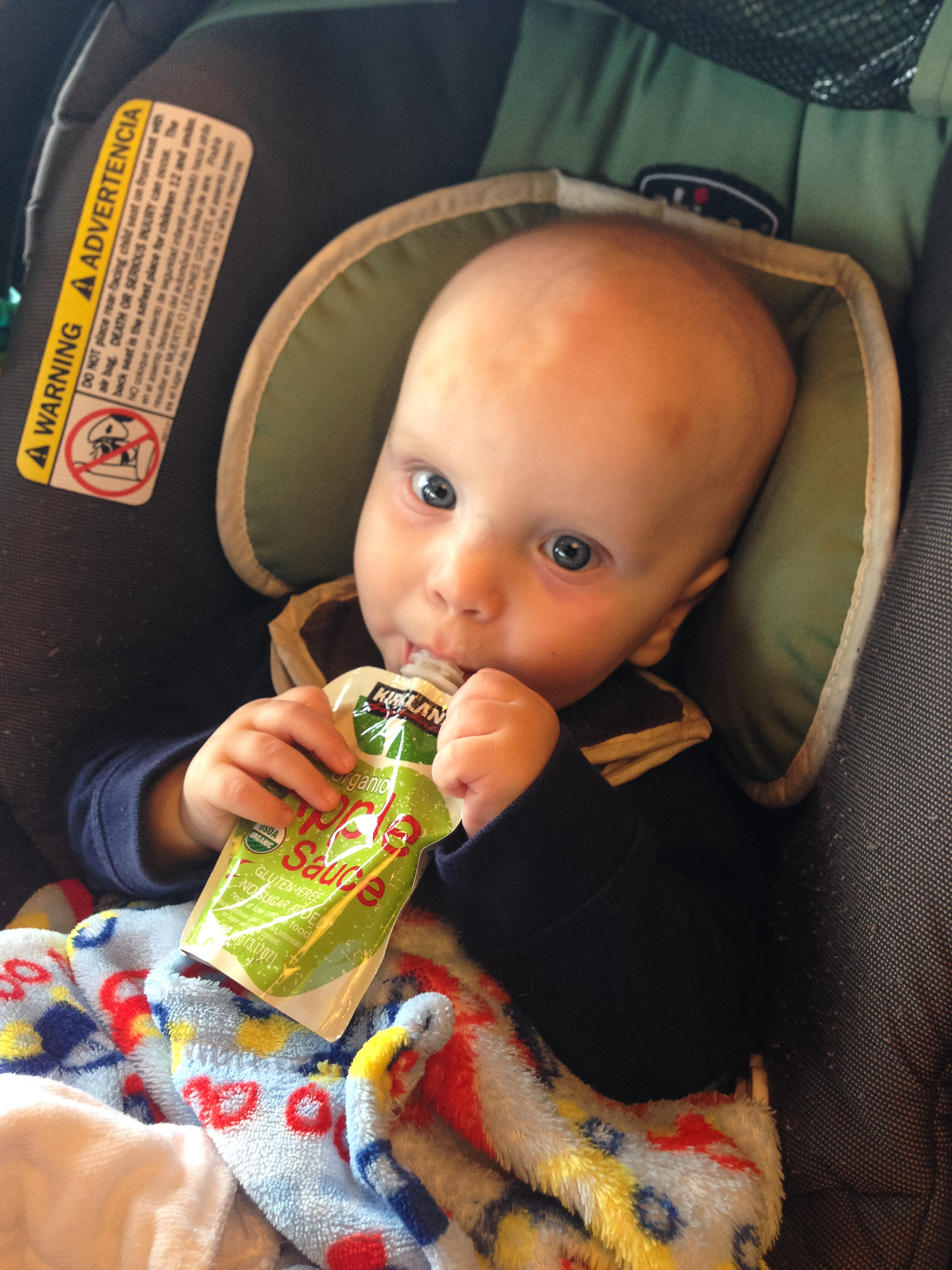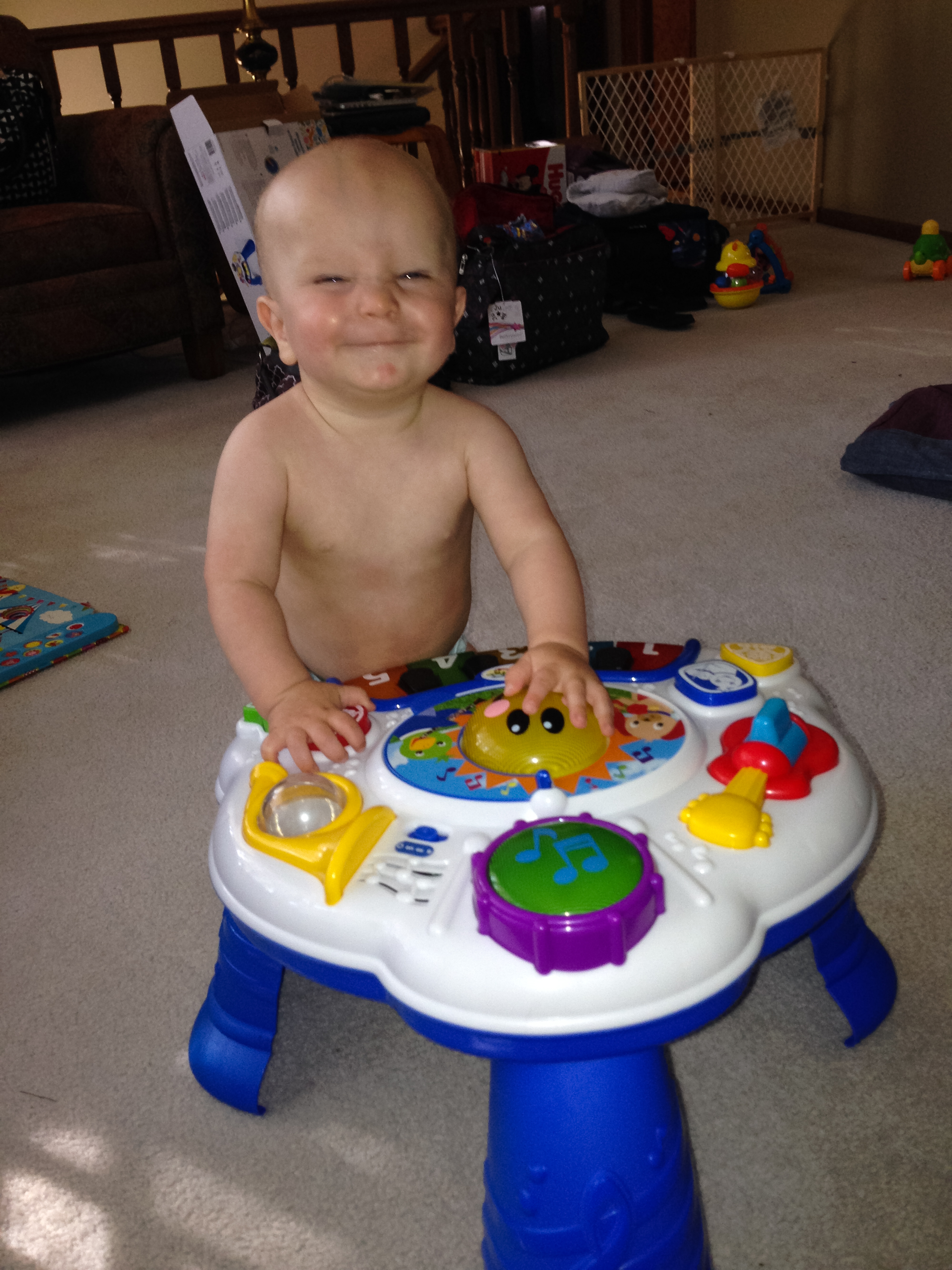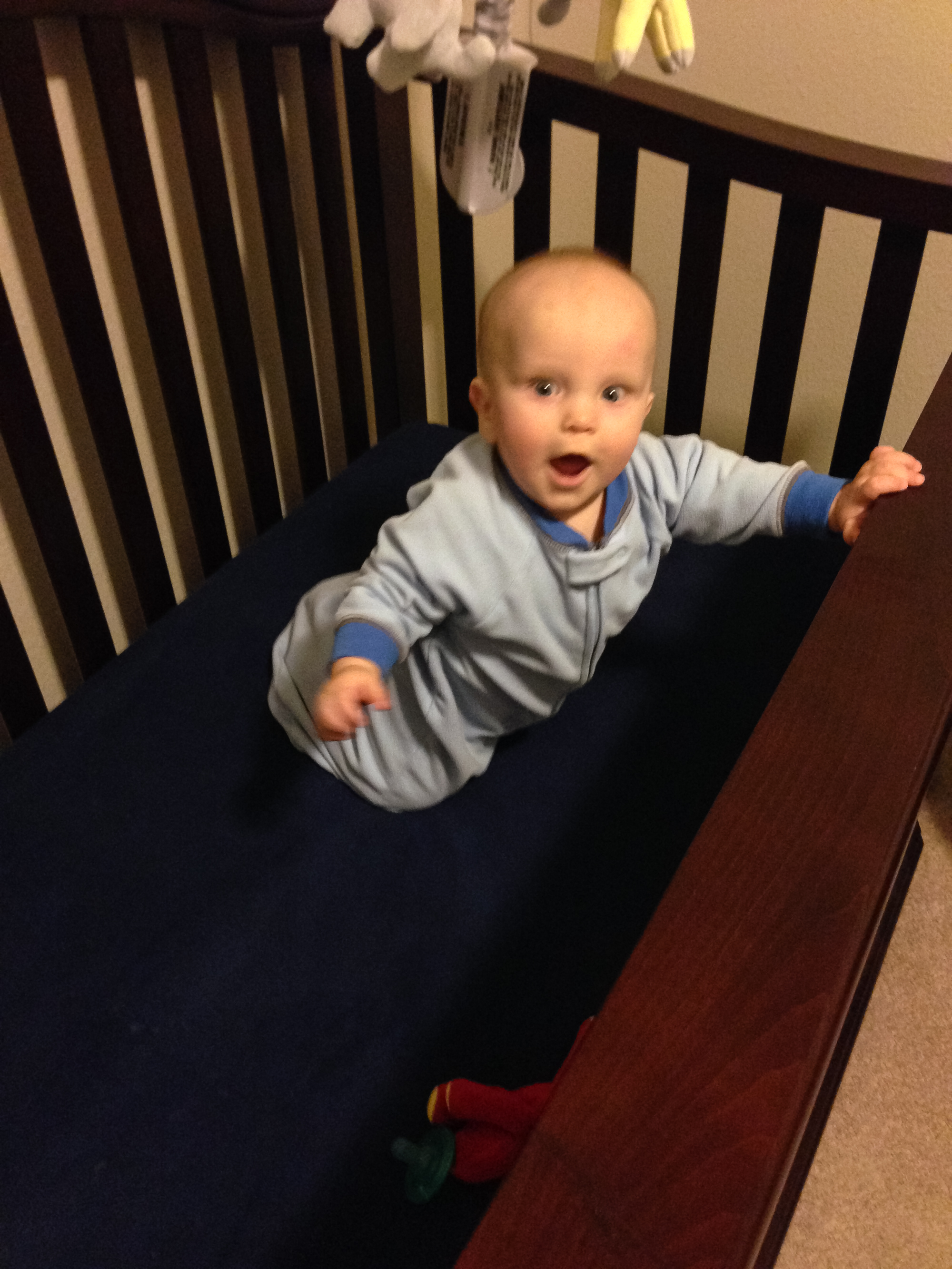 You decided it was time to move the last two months, so move you shall! From just rolling and scooting, to army crawling, to full out crawling and pulling up on everything in sight. Fortunately, you’ve switched to a lot more actual food to fuel all that activity. You can’t eat all that many things with all of your allergies, but even so you’re celebrating what you can.