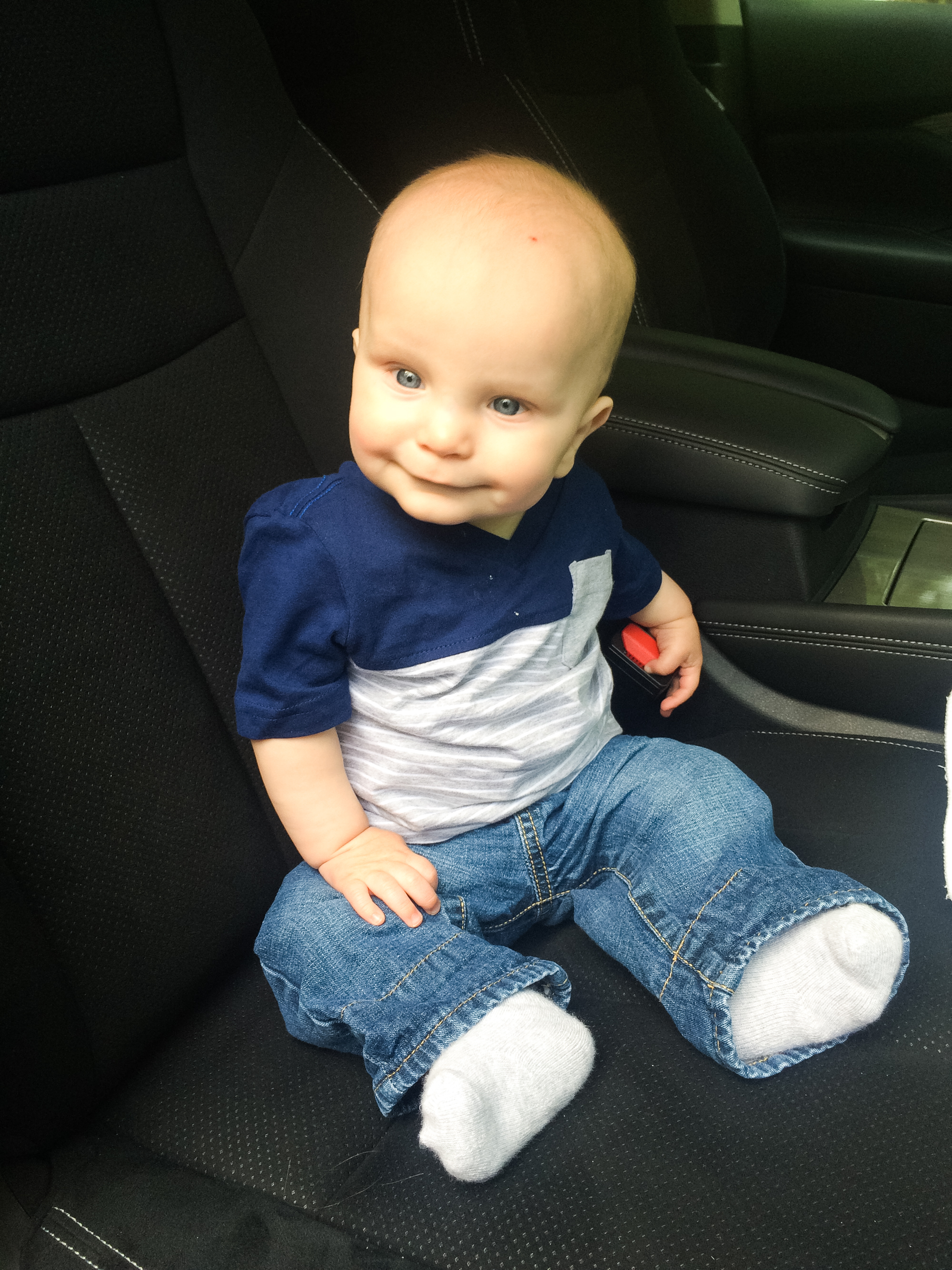 Each day also brings new interactions with the world, waving and smiling, eating and sitting in carts and chairs and the high chair for the first time. You army-crawled right over to Molly’s water dish, and then looked shocked when you got water everywhere. There’s lots to learn in the world!