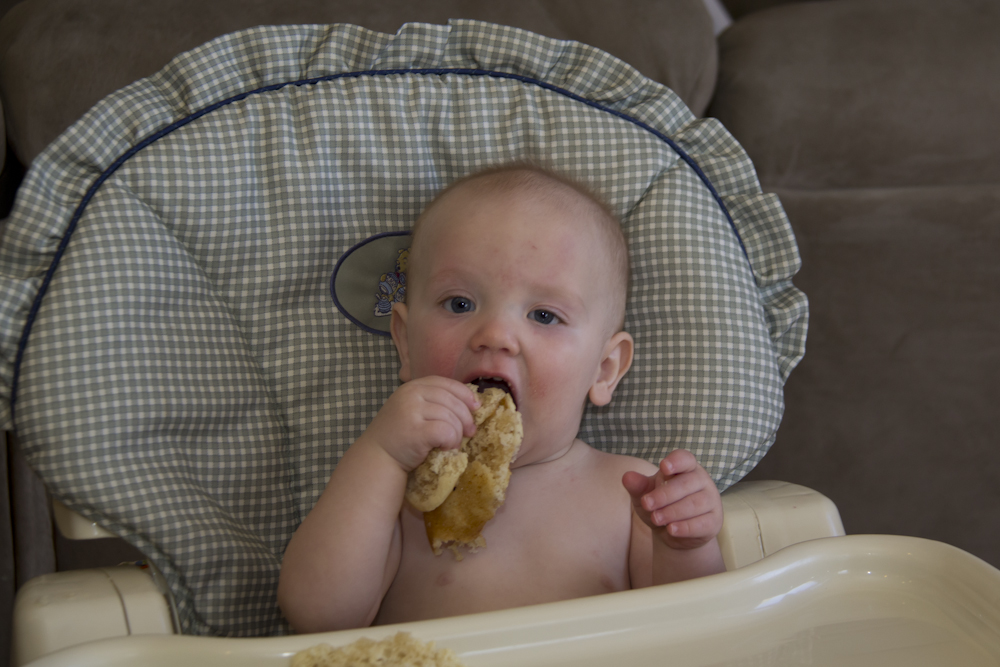 We spent most of the rest of the month packing up the house to move out to San Diego, and watching you get more and more mobile and in trouble. You’re climbing into everything and onto everything you’re tall enough to get on. I turned around for just a second, and you were up on a banker box trying to climb up the bookshelf. When you get tired of walking back and forth between us, you spend you time practicing your words, from “dirty”, to “button” to “Debbie”. That’s right, when asked to say “Nana”, you pulled out “Debbie”.