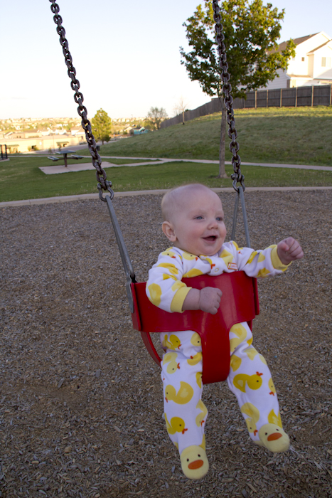 Finally, you started the swings at the park. On top of the swinging back and forth in our arms, you’re definitely going to be an adrenaline junkie. Can’t wait until you start walking, because that likely means that you’ll be jumping off the furniture. We’ll have to move you out of a crib an onto a mattress on the floor so you have less distance to fall. Until then, you’ve started rolling over to sleep on your tummy, which turns out to be the cutest thing ever.