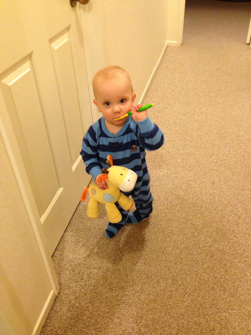 You now make sure that we never forget to pray at mealtimes, even if you’ve already eaten. You run over to the table and say “pray!”, ending with an enthusiastic “Amen”. It’s not 100%, as your answer to “how do we end a prayer?” was “all done!” Finally, to win the month, you told Mommy “lub you!” for the first time. While we know that a lot of what you’re saying and doing is mimicking what you see us doing, it’s so apparent that you’re grasping concepts like “love you”, and it’s more dear that we know how to say. Each night you give mommy a kiss and say “lub you” on the way up the stairs to bed. We love you, too, little man. May you continue to have a heart to pray and to love your parents and others as you continue to grow and learn.