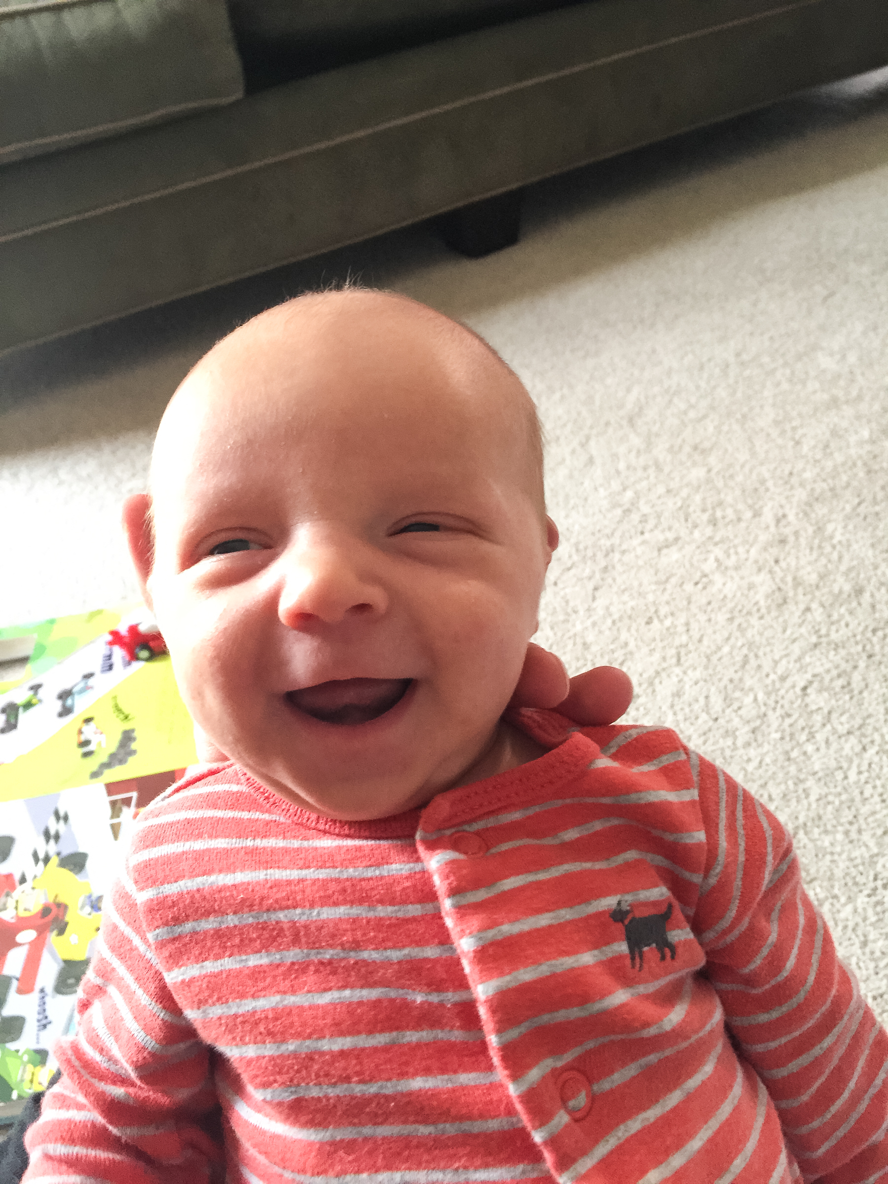 Still, you are a joy to cuddle in just a diaper, with your little arms and legs curled up on a chest. Your switch to nighttime alertness about halfway through the month resulted in lots of time nursing with Mommy (like, every hour and half), and lots of snuggle time with Daddy when you wanted to hang out rather than sleep. (Side note: a huge thanks to Mommy’s parents for dropping things and coming out to stay for 10 days when you were born!)