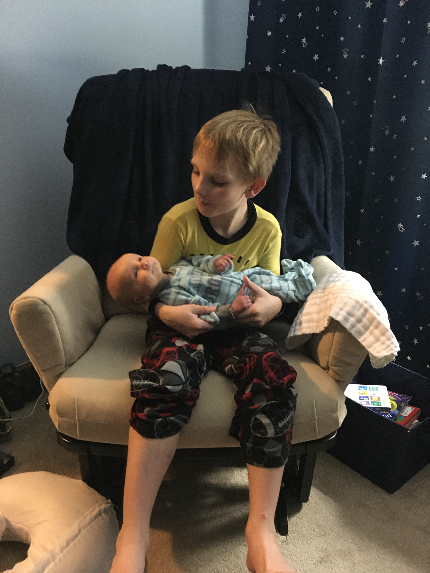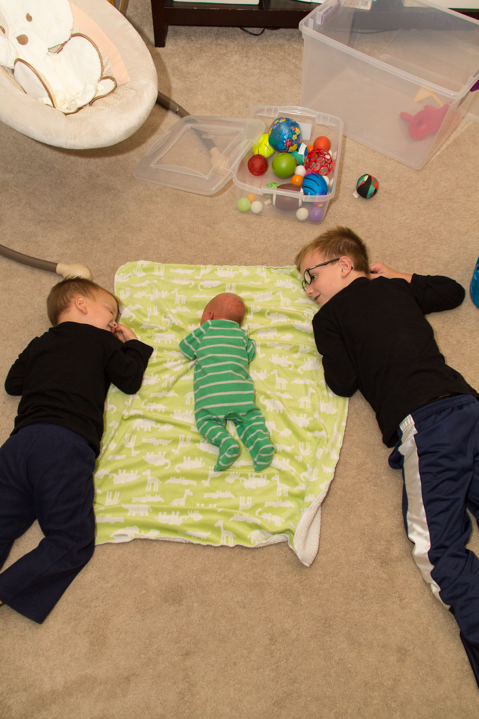 Second only to holding you ourselves is watching your brothers fawn over you. From the moment you got home from the hospital, both Seth and Noah are very excited to have you in the house. From snuggling up to you on the playmat, to “Can Titus come read books for bedtime?”, Titus makes the rounds in the house with the boys. Seth is so proud to be big enough to hold you while standing up, so much so that he’s doing it just because he can. The boys love helping with your bathtime. Seth wanted to learn to put on your jammies, and then sat right down in the rocking chair with you while you fussed, to calm you down (which he did.) Noah takes a different tack when you fuss on the playmat, bringing you toys and singing “Twinkle, Twinkle” and the ABCs.