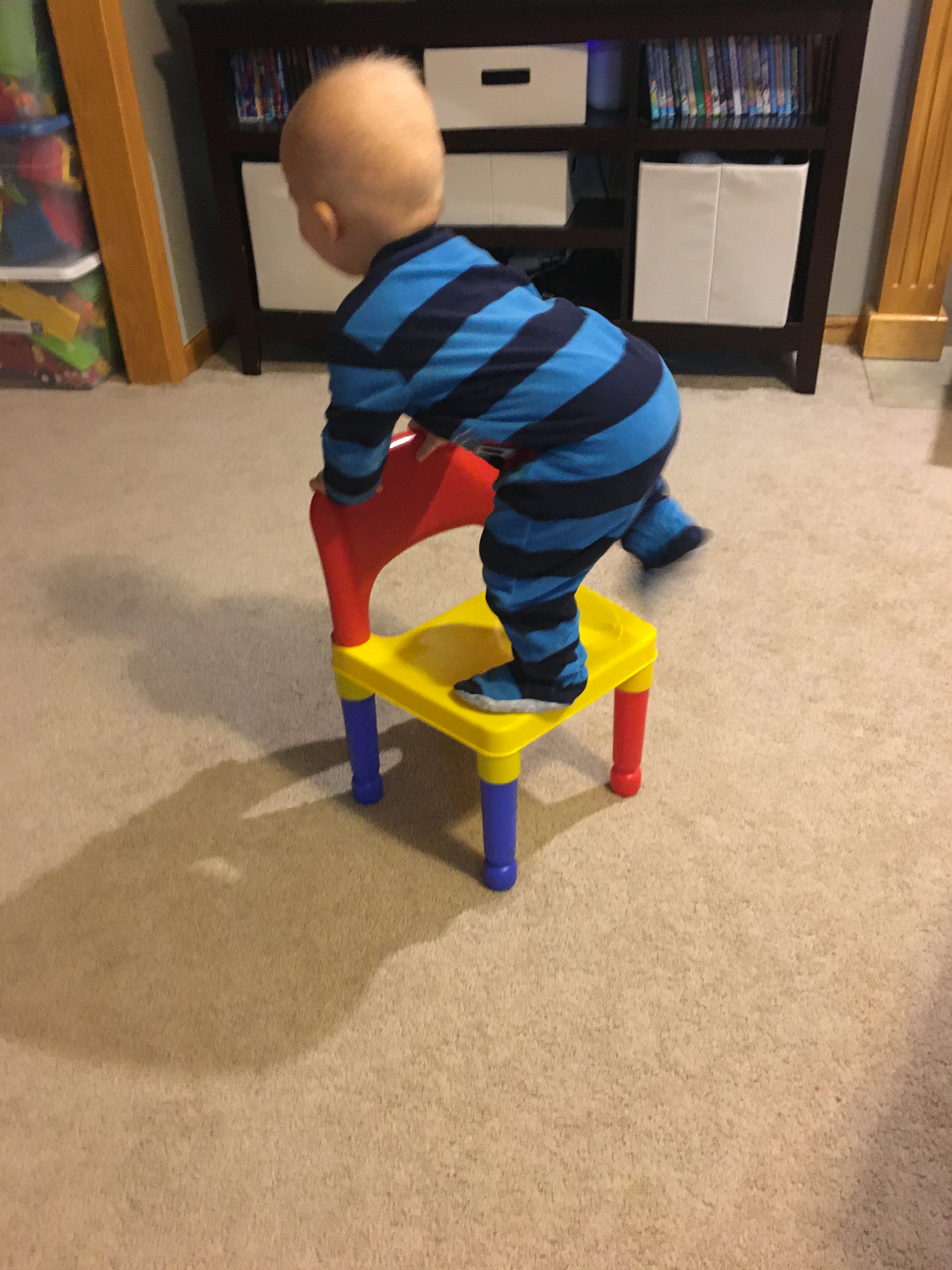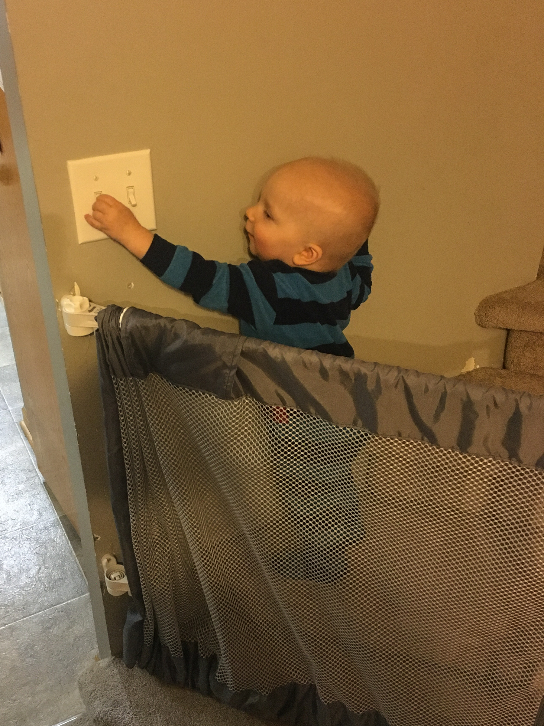 If you can reach it, you have to explore it. If you can touch it, it’s going to get pushed, switched, pulled, turned, twisted, or knocked down. Once you realized you were tall enough to reach the tablecloth, you realized you could pull on it. Sippy cup out of reach? No problem, pull the whole tablecloth toward you until the sippy cup falls on the floor. Good strategy, until the day that you pulled the tablecloth with the plates and cup of milk. On an unrelated note, we don’t use a tablecloth in our house anymore.