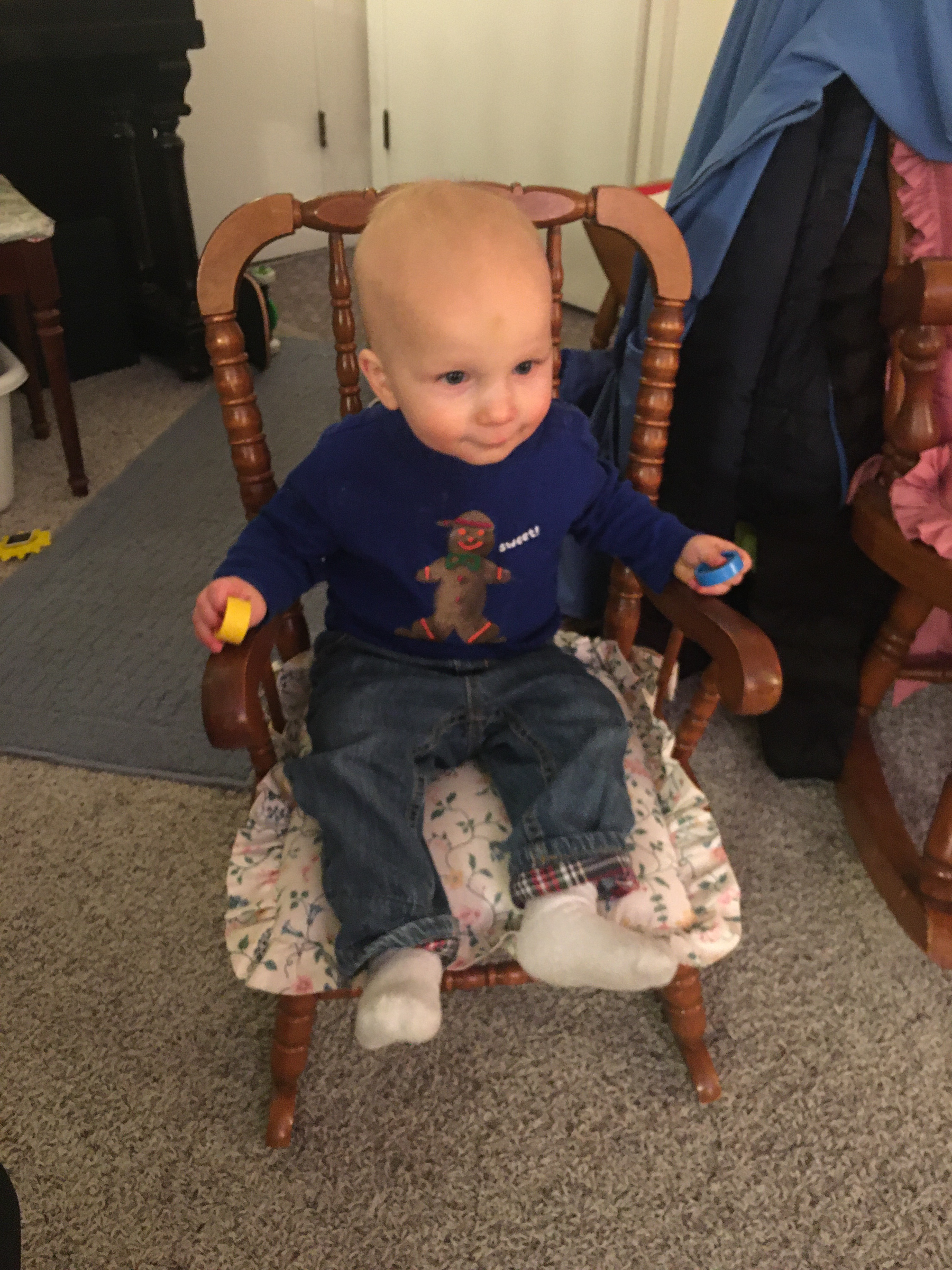 Food this month means more exploring of all the possibilities of taste. You figured out that you love to use a fork, and are working very hard to learn to use it, to include attempting to eat your peanut butter and jelly sandwich with it. Being the first of the three brothers to not have a food allergy as a baby means that you also have the opportunity to sample many more foods, as well as trying out those words. You can identify all the boxes and bags in the pantry, and clearly give us a head shake and “no” when you’d like to have a different cereal or box of crackers for snack. At least, you can try the “no”. It’s only working now because you’re so cute. You love candy, and know exactly which (upper) cabinet in the kitchen holds all those goodies. Your blanket term for all things sweet is “cookie”, and Daddy seems to hear it a lot when he gets home from work and first picks you up in the kitchen.
