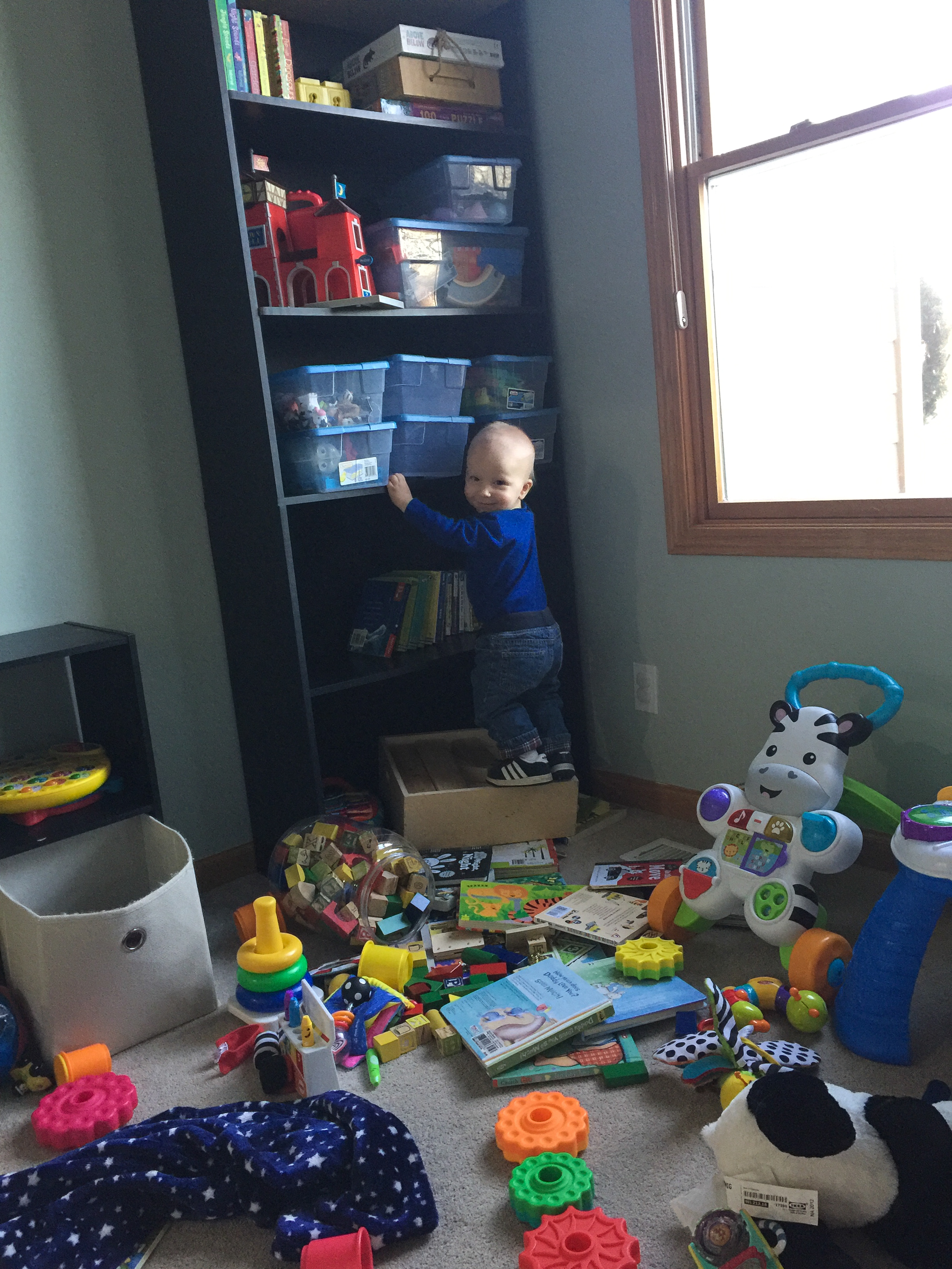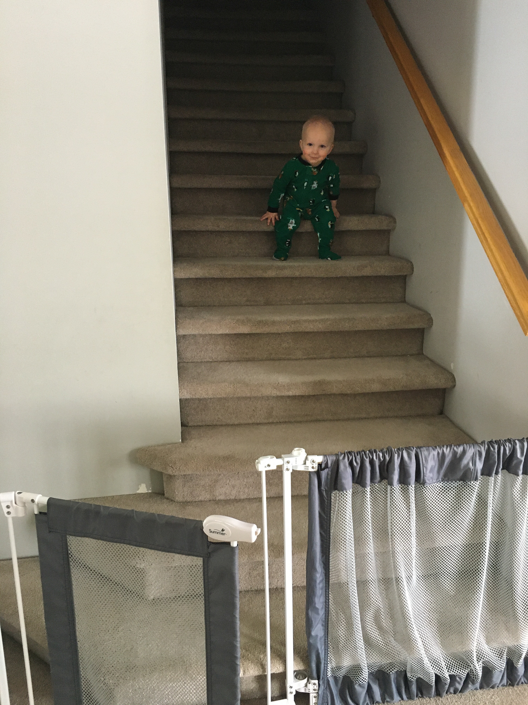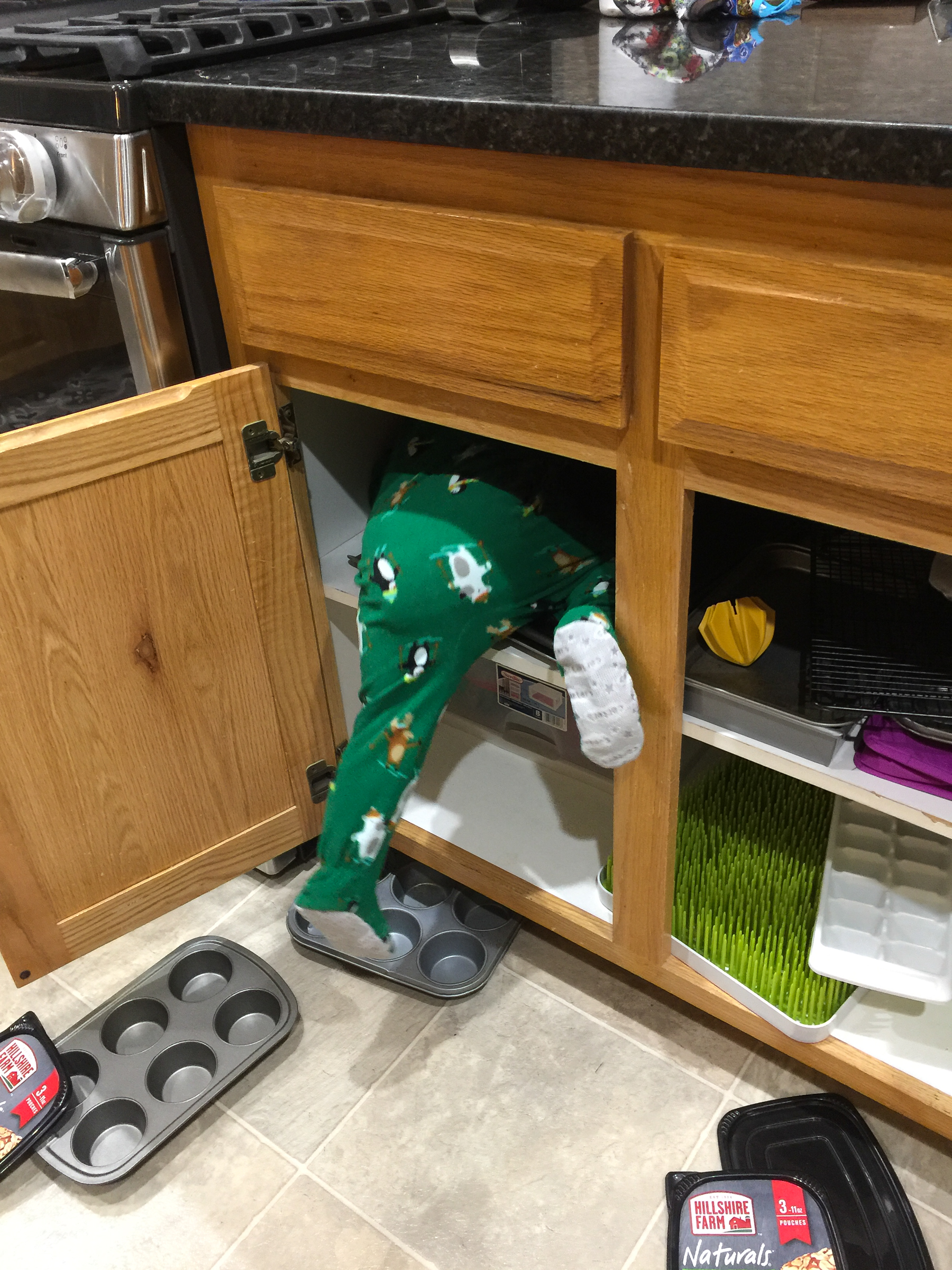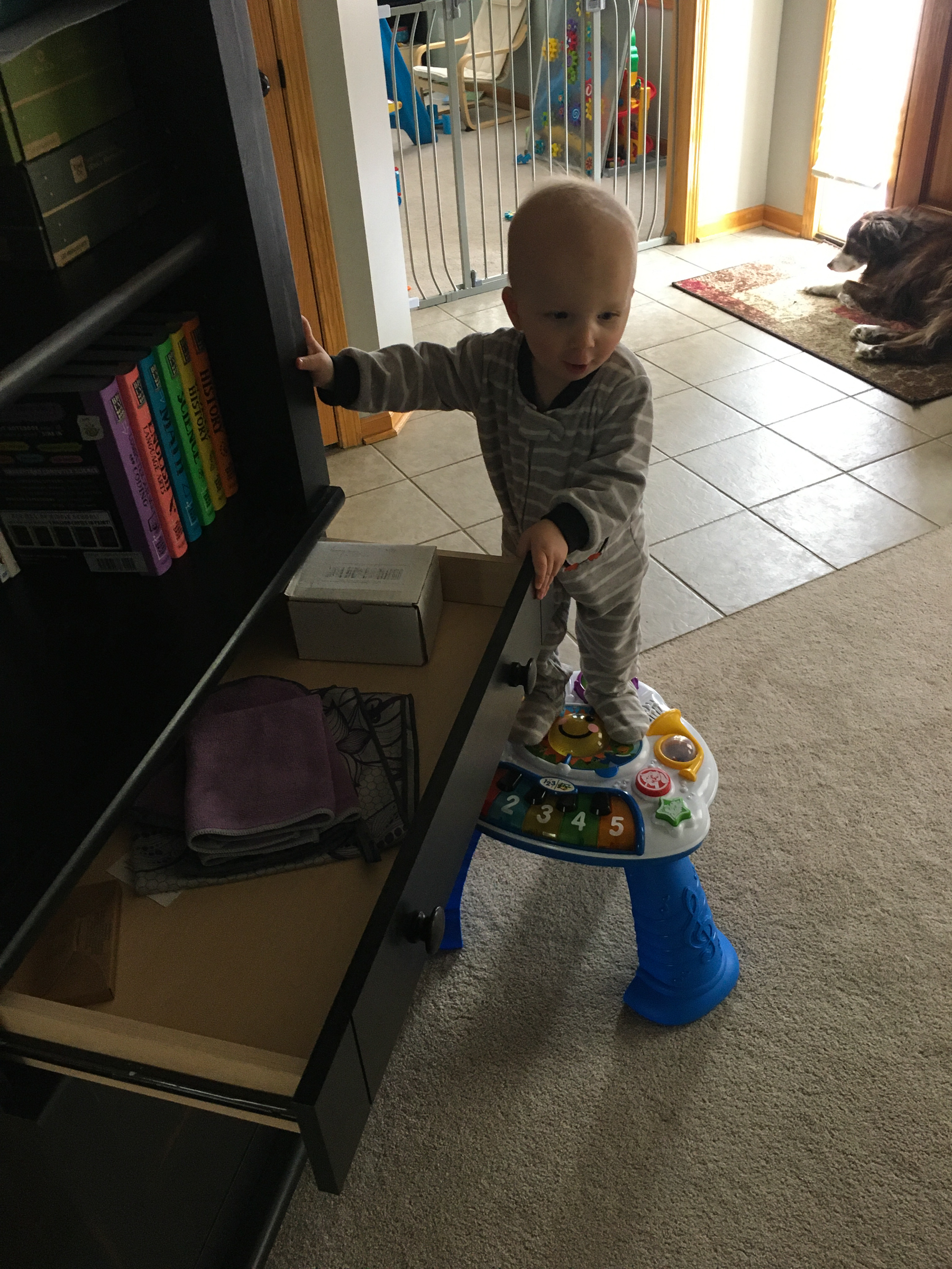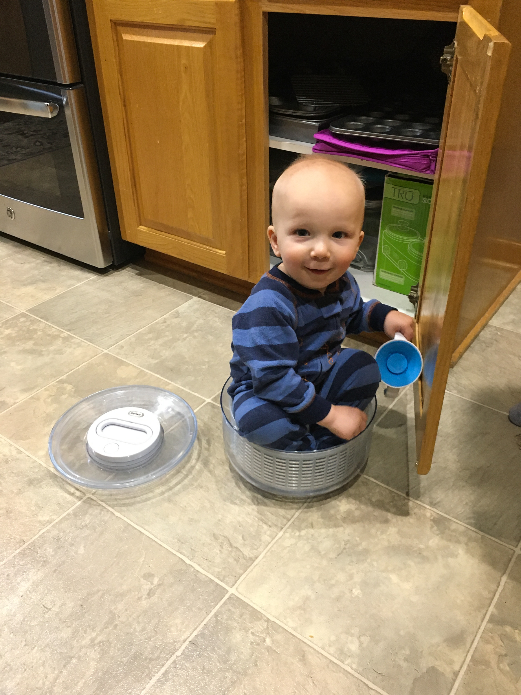 You are very determined to figure out the world around you. No matter what it is, you’ll examine it closely, or watch your brothers do it, until you’ve got it figured out. From light switches, to the baby gates, to drawers and cabinets, we’re pretty sure you know how it all works, even if you can’t quite use it yet (or we have it baby-locked). This all started with light switches, which you will happily play with when you can reach them. Nana’s level-style door handles were next, with you up on those tiptoes to open the pantry for a snack. Now you’re pushing your play table around to climb up and open the drawers. You can also reach most of the drawers in the kitchen, and the lower cabinets. It’s like watching a tornado go through the kitchen sometimes, as fast as you can unload everything onto the floor. You especially like to open the drawers by Mommy’s bathroom sink, to find your toothbrush. Still, your favorite toy this month is Daddy’s protein shaker cup. Just pouring in those ingredients brings you running right over to take it, shake it, and carry it around the house with you.