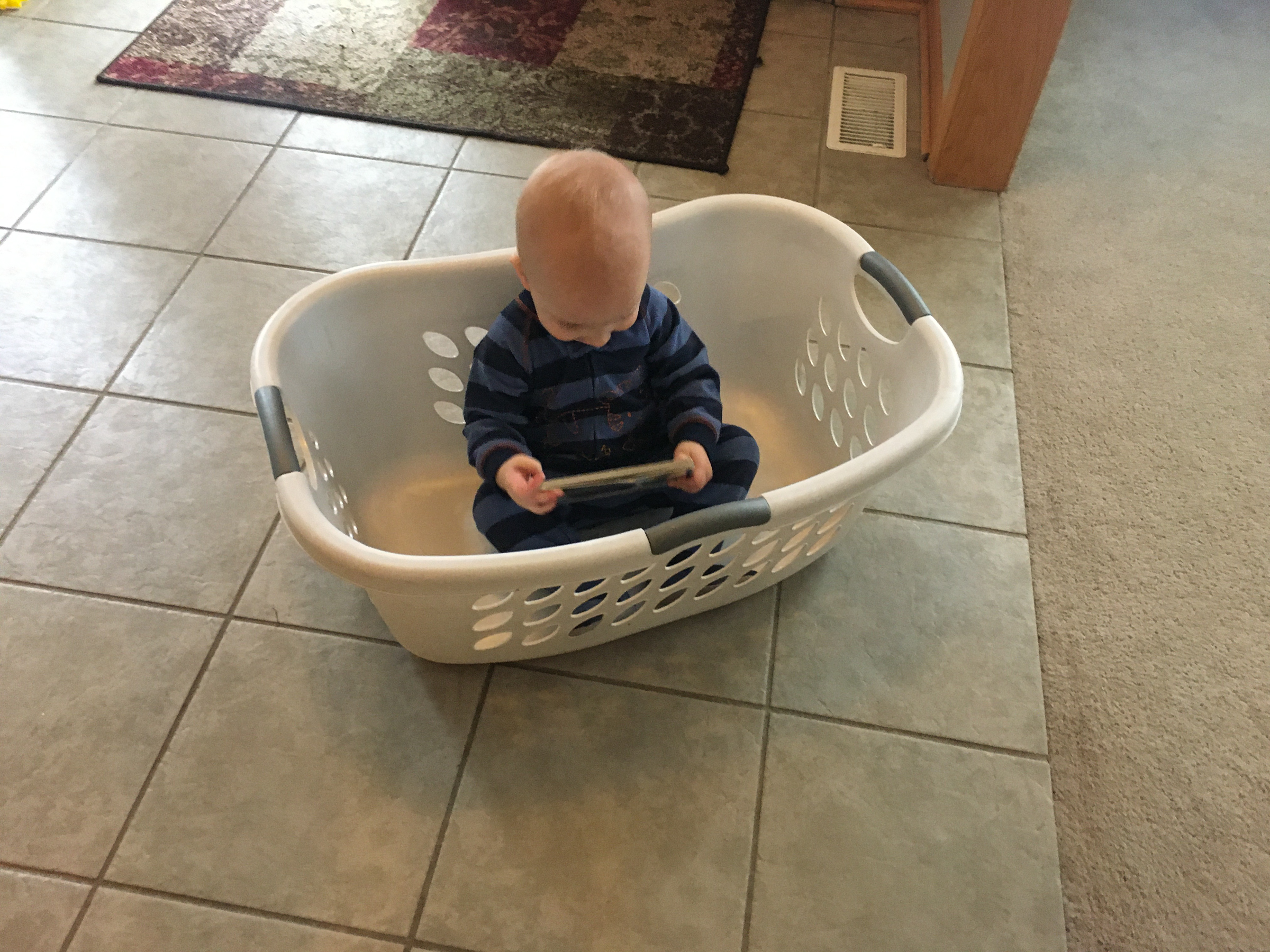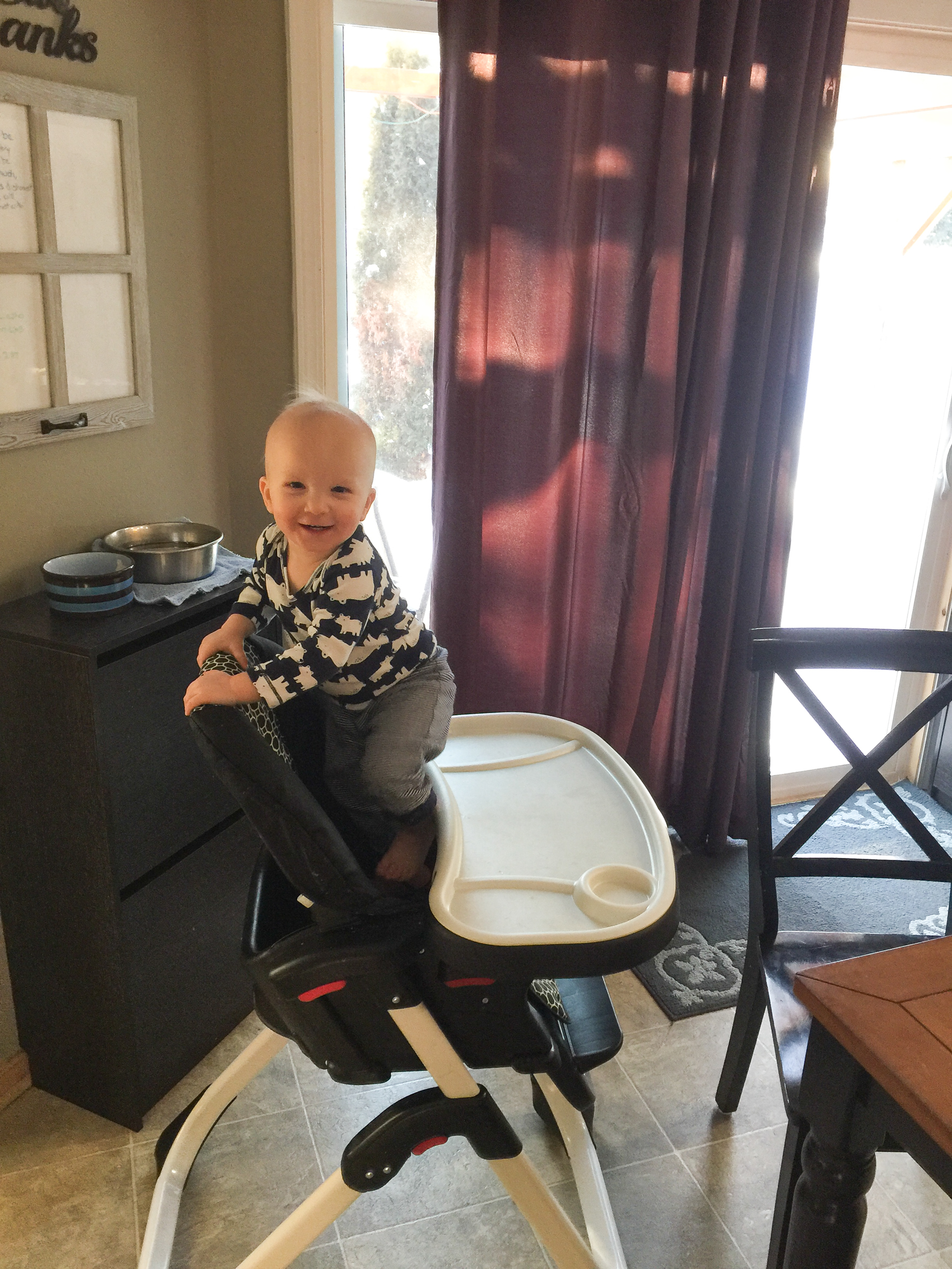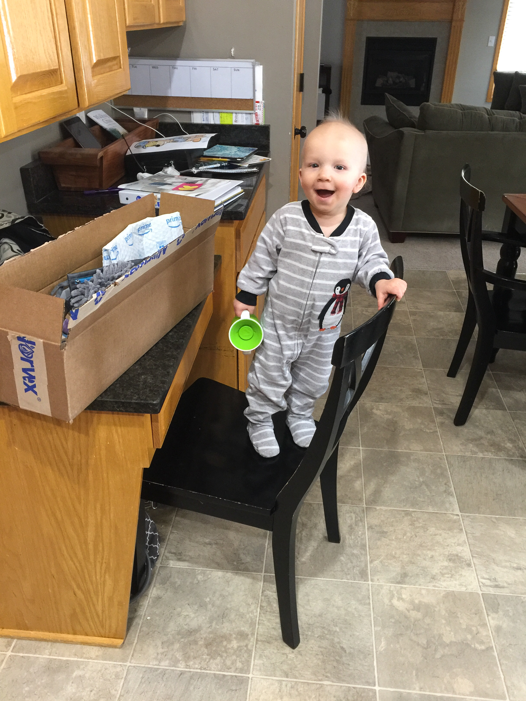 So…busy. We have truly raised and released an independent force of nature on the world. You’ve figured out how to climb, so we find you on the kitchen table, on the counters, on the _______. You’ve also discovered that the chairs move around, which pretty much gives you access to most surfaces in the house, along with the light switches. You can swiftly pull out the chairs and climb up to the table or the counter. Seth fixed the problem by putting a post-it on your back that read “Take me off the table.” Not sure that’s a long term solution, but at least your brothers are looking out for you. We’ve found you bridging from your chair to your high chair, climbing over the tray and into the seat in a precarious maneuver. Thank goodness that baby equipment comes with straps and buckles.