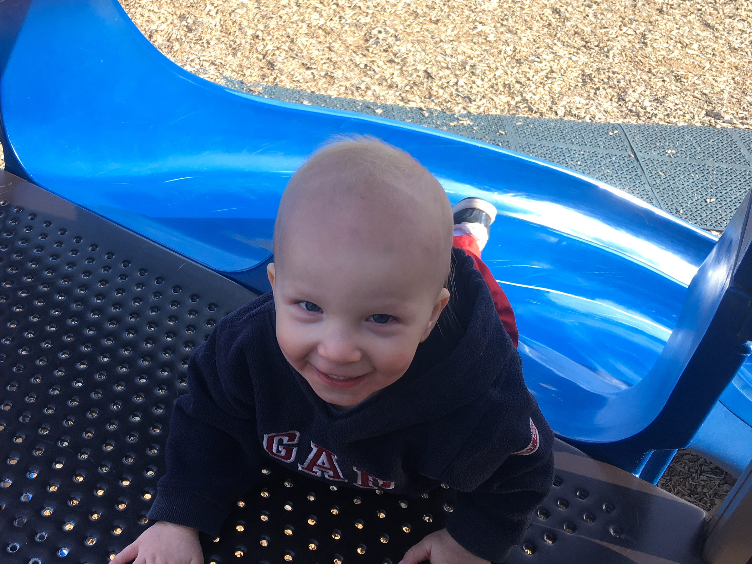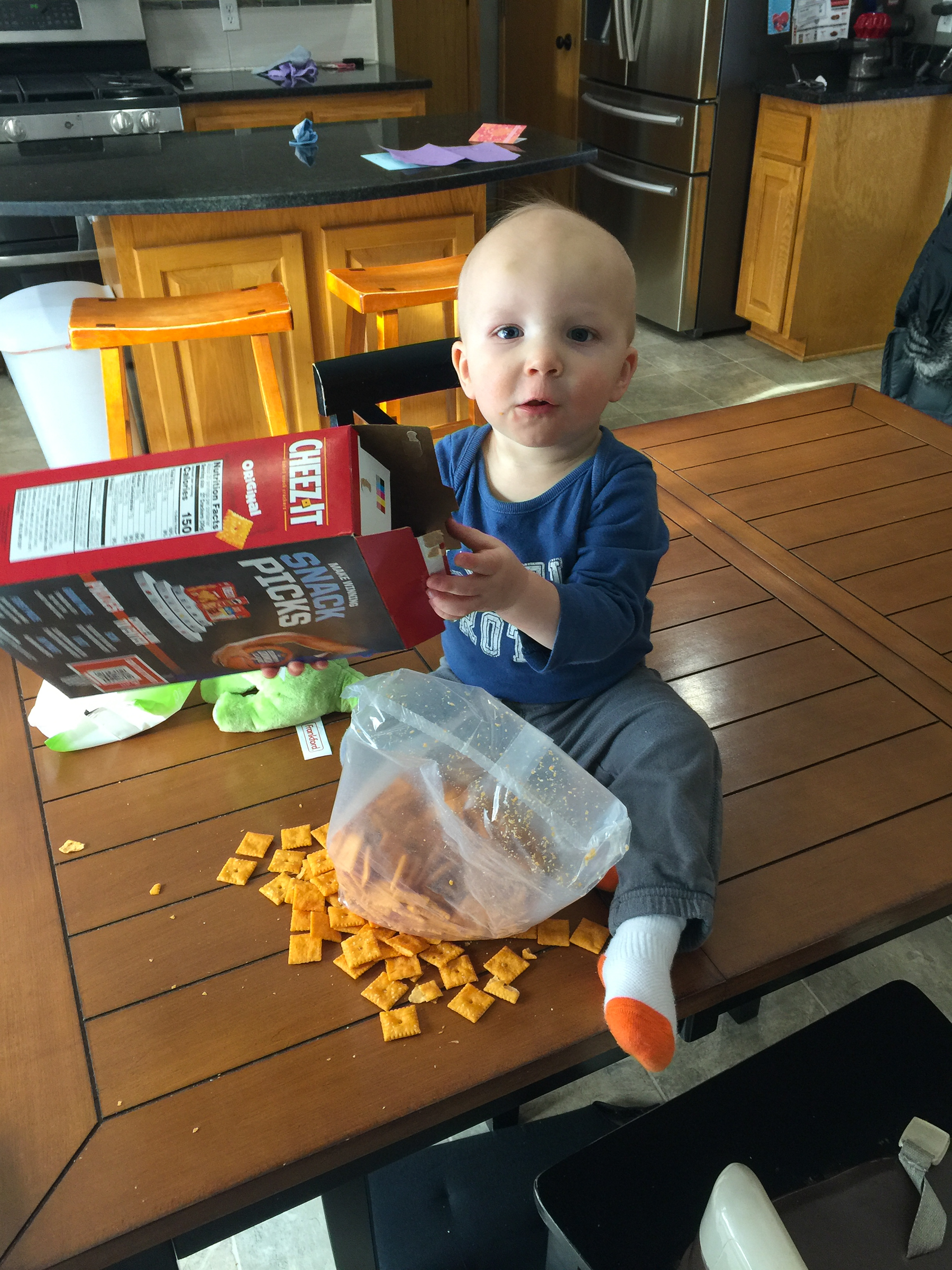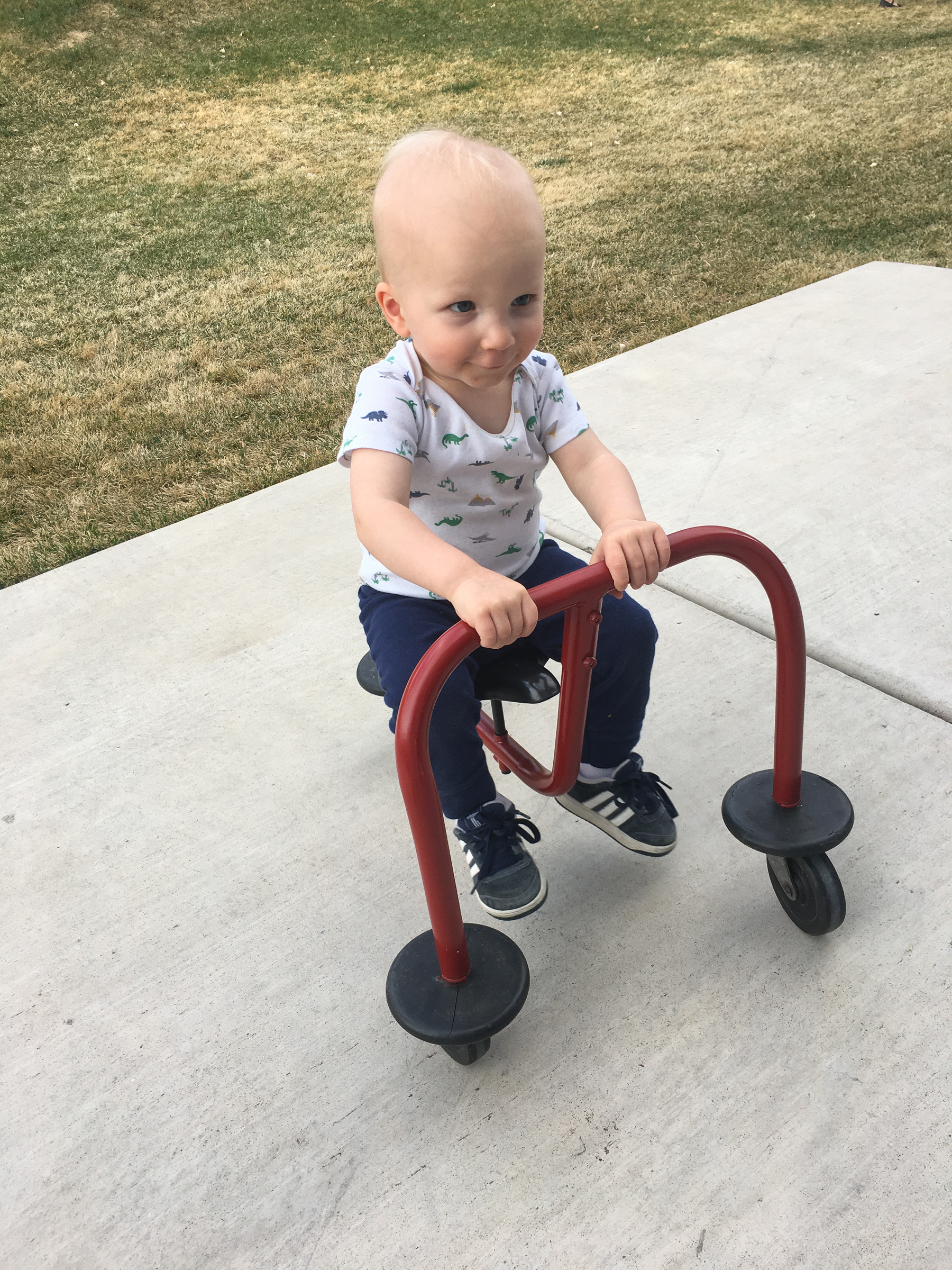 So…busy. We have truly raised and released an independent force of nature on the world. You’ve figured out how to climb, so we find you on the kitchen table, on the counters, on the _______. You’ve also discovered that the chairs move around, which pretty much gives you access to most surfaces in the house, along with the light switches. You can swiftly pull out the chairs and climb up to the table or the counter. Seth fixed the problem by putting a post-it on your back that read “Take me off the table.” Not sure that’s a long term solution, but at least your brothers are looking out for you. We’ve found you bridging from your chair to your high chair, climbing over the tray and into the seat in a precarious maneuver. Thank goodness that baby equipment comes with straps and buckles.