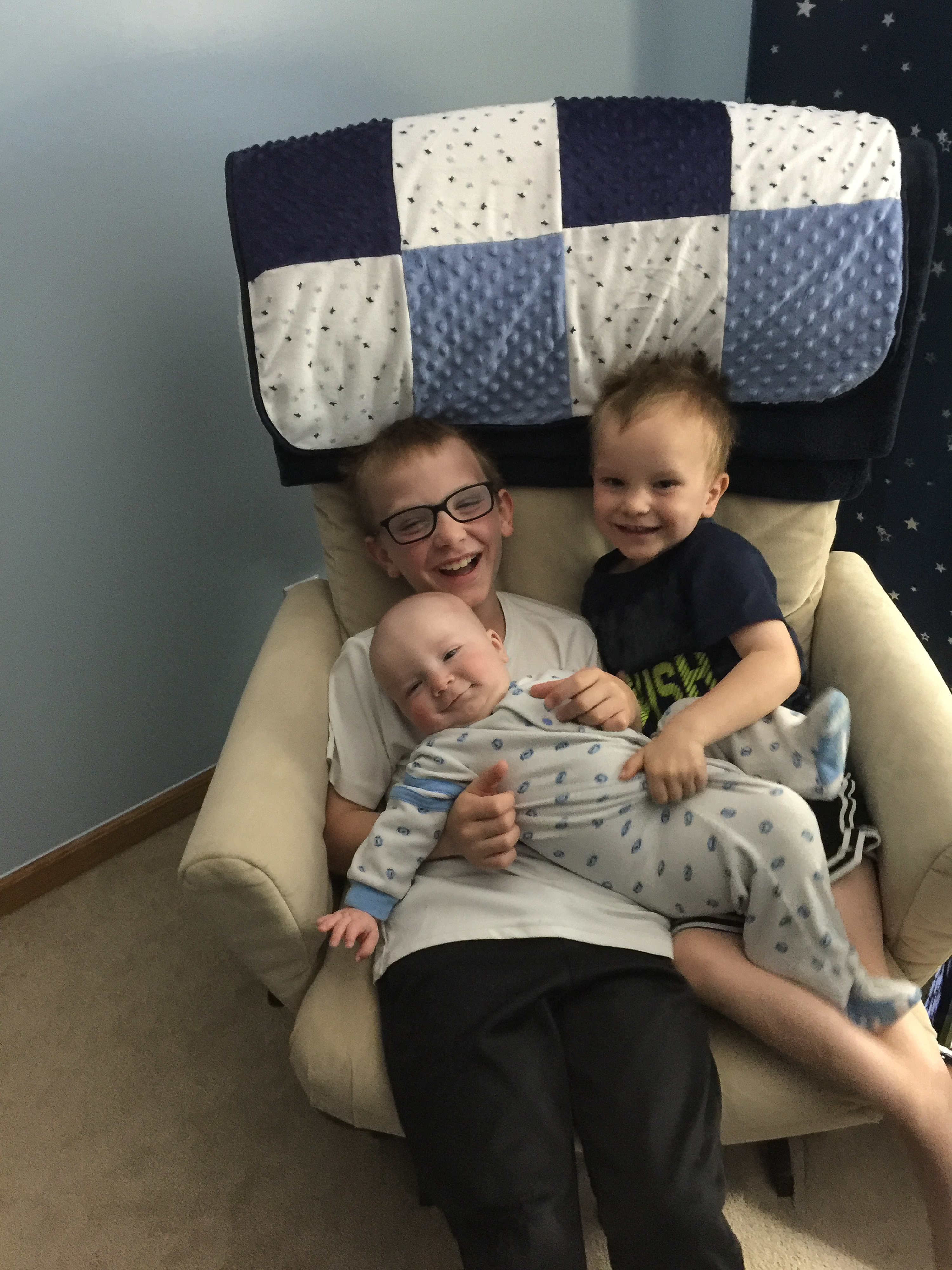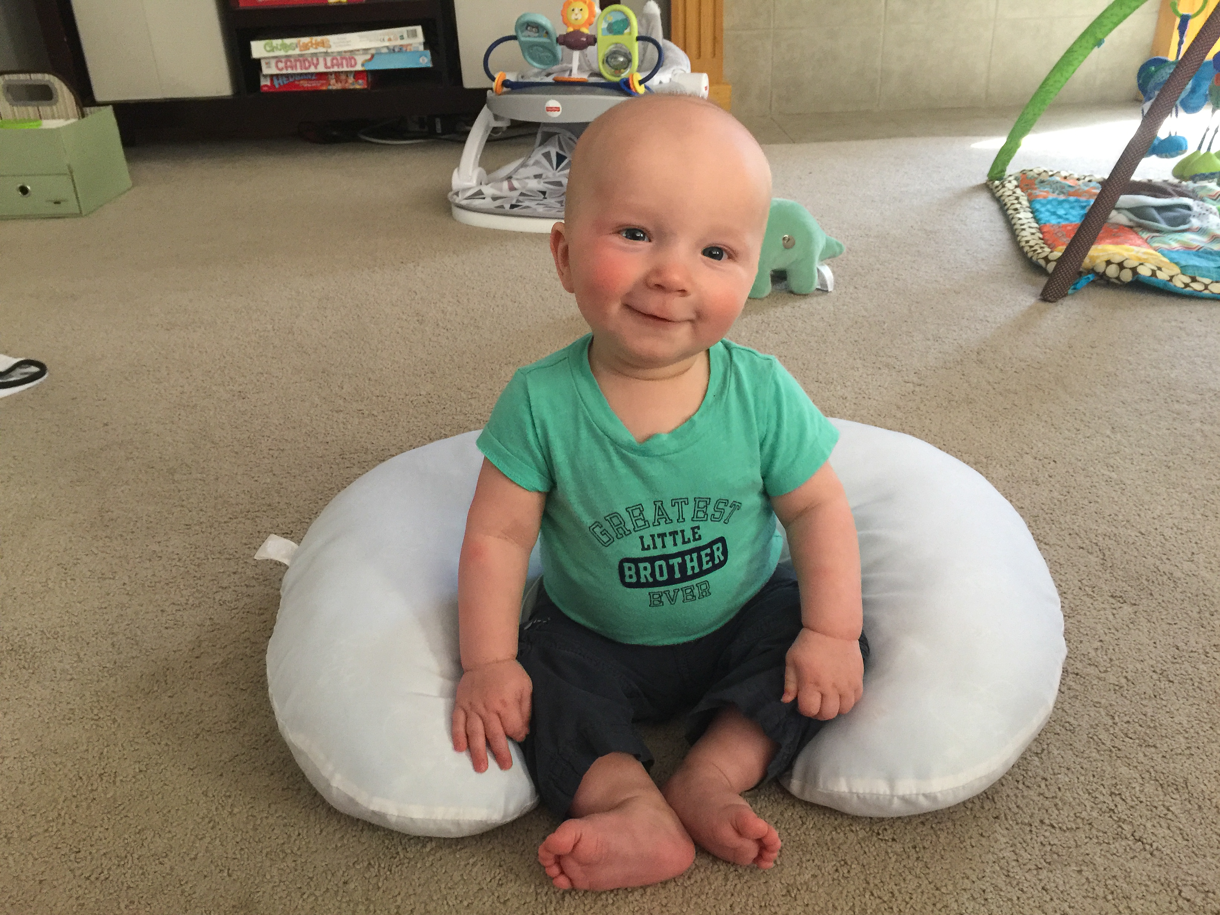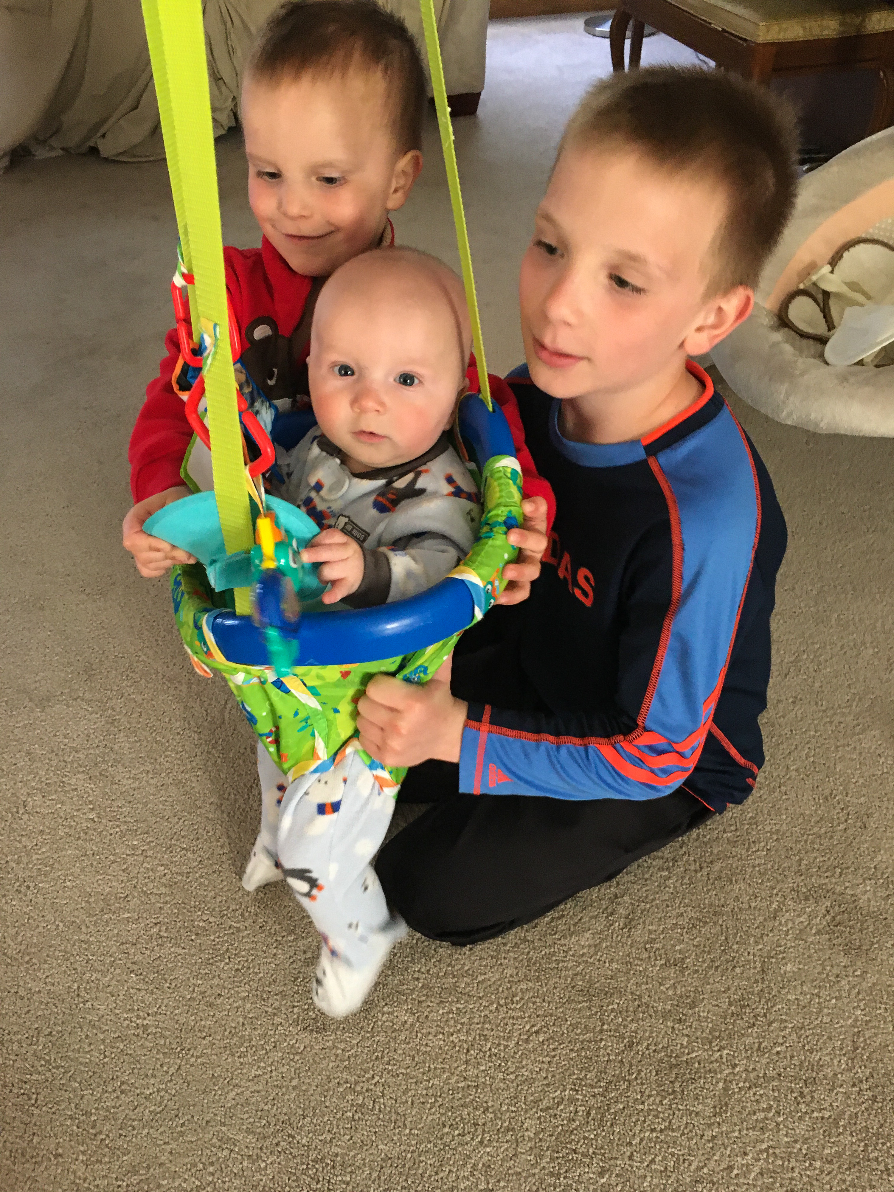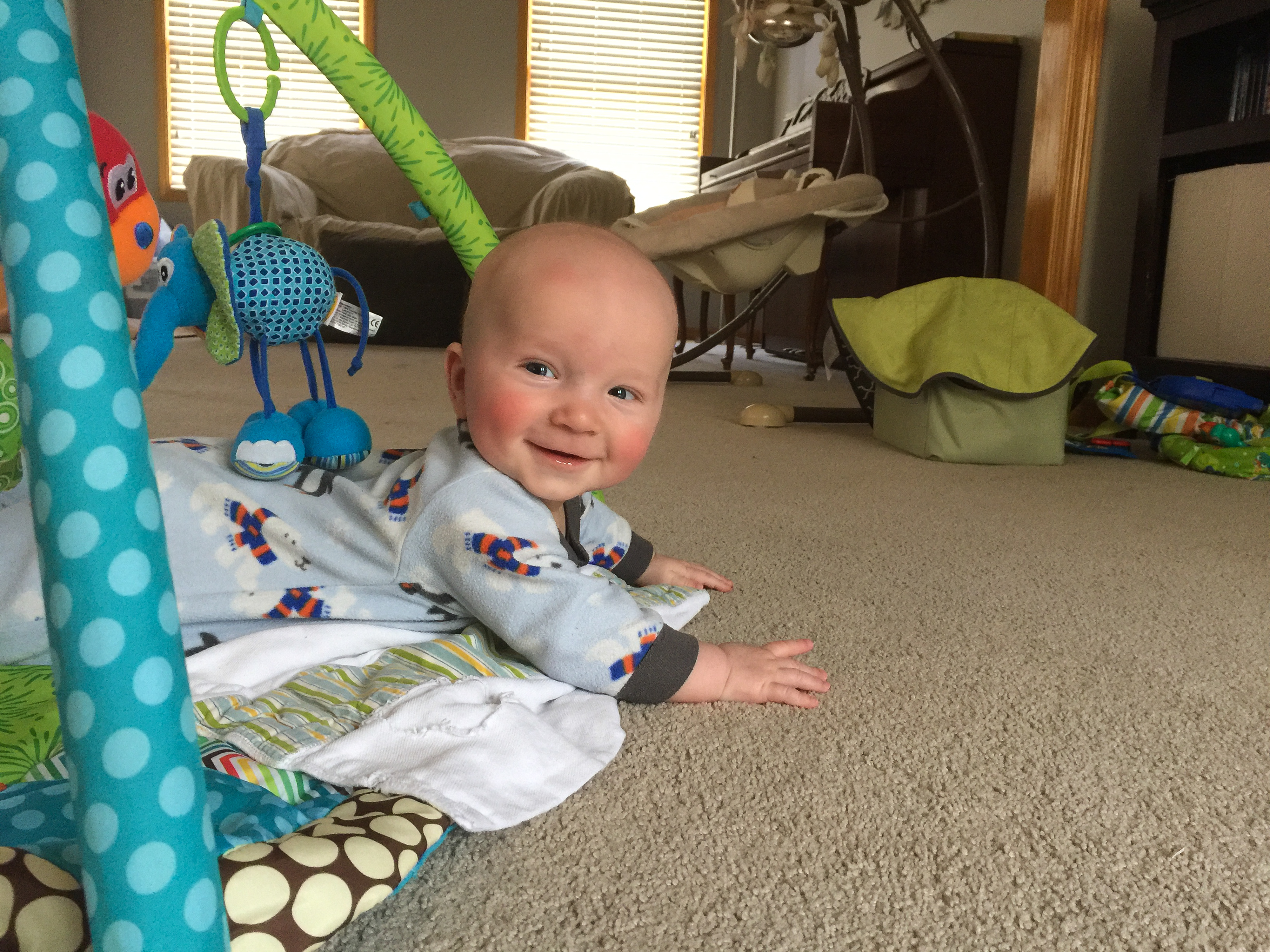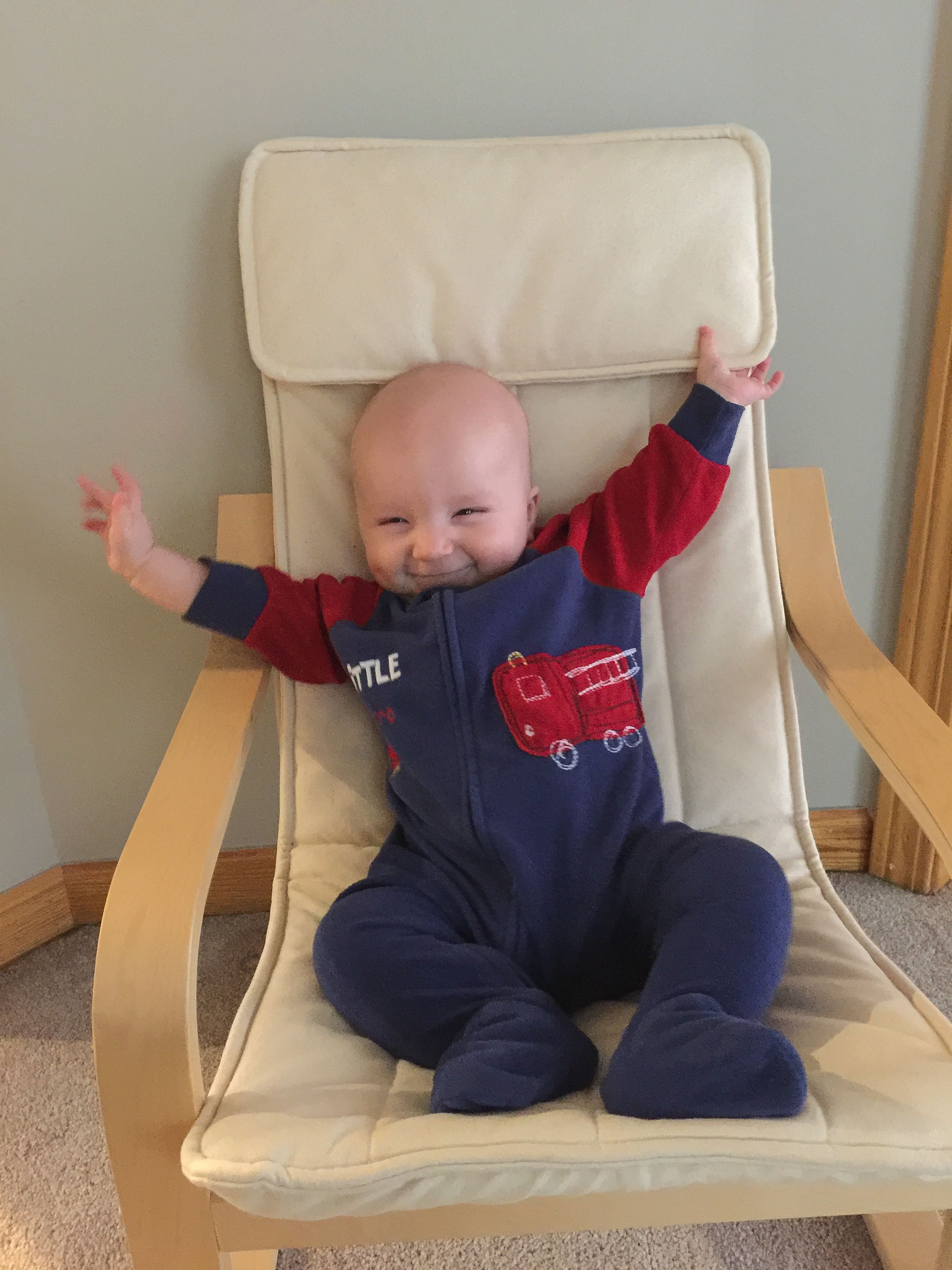 Those eyes are hard at work this month, tracking everyone and everything around you. As the boys run around, and play, you love to watch them and all that they do. And where those eyes go, those hands go, now. Reaching out for everything, grabbing and playing with all your toys, and it’s extended to everything else that comes into range. Talking with Daddy on FaceTime? I’ll take that phone. Daddy’s drinking coffee? I’m going for that mug handle. Even with all the new things in the world, your favorite thing to hold is still Mommy’s hair while you nurse. You quite realize where Mommy keeps the milk, and have taken to trying to grab and move her shirt when you’re hungry.