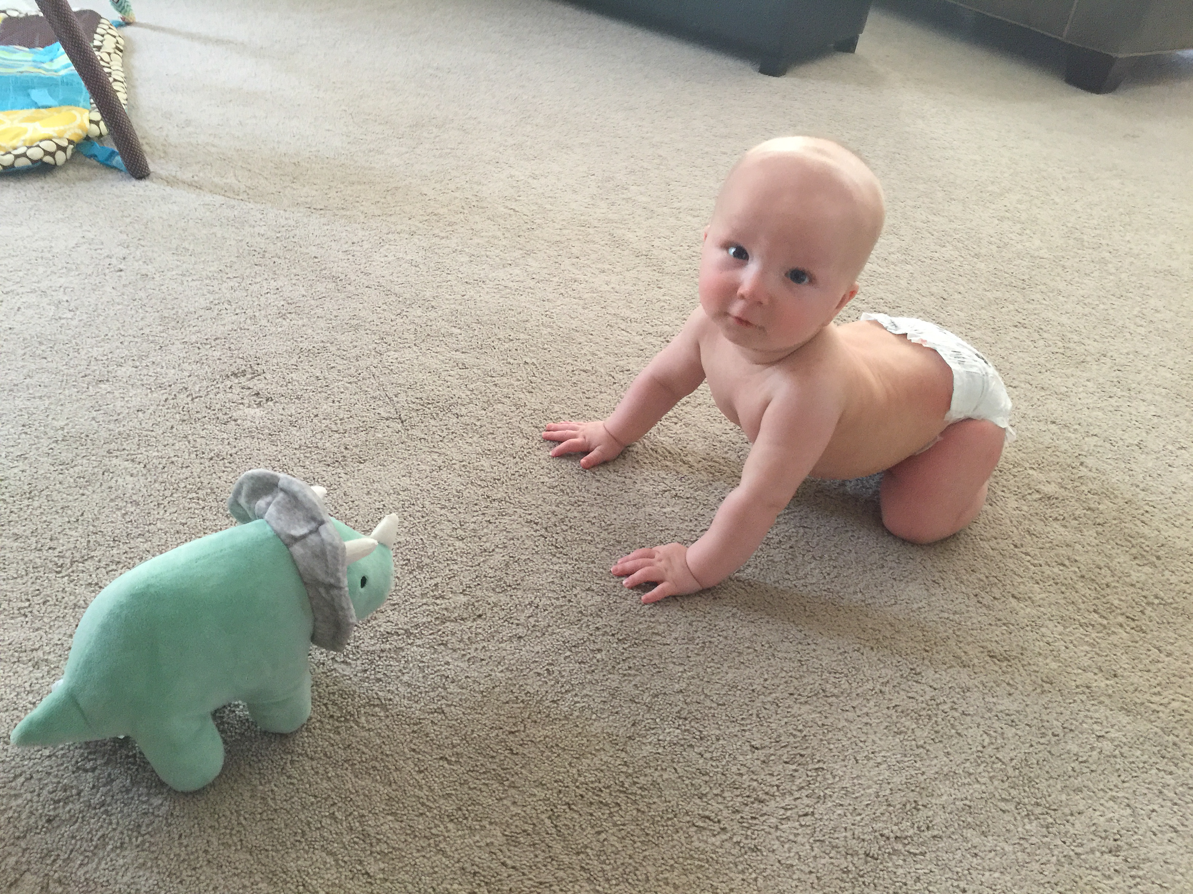 And with that, you’re half a year old. We’re half a year into playing a zone defense, which looks like it’s about to get a lot more complicated. You’re up on hands and knees (barely), rocking a little, trying to army crawl, rolling over, and generally trying to get moving. It looks like this next month will require locking down the house again. With two older brothers who love Lego, you’re just not ever going to be allowed on the floor near their bedrooms. We no longer find you on your back, ever. Any time we put you down, you’ve flipped right to your tummy, and raised up on your hands to look around. Occasionally, the middle of the night is a time for an hour or more of scooting around your crib, pulling those knees in, and other general “getting ready to crawl” workout time.