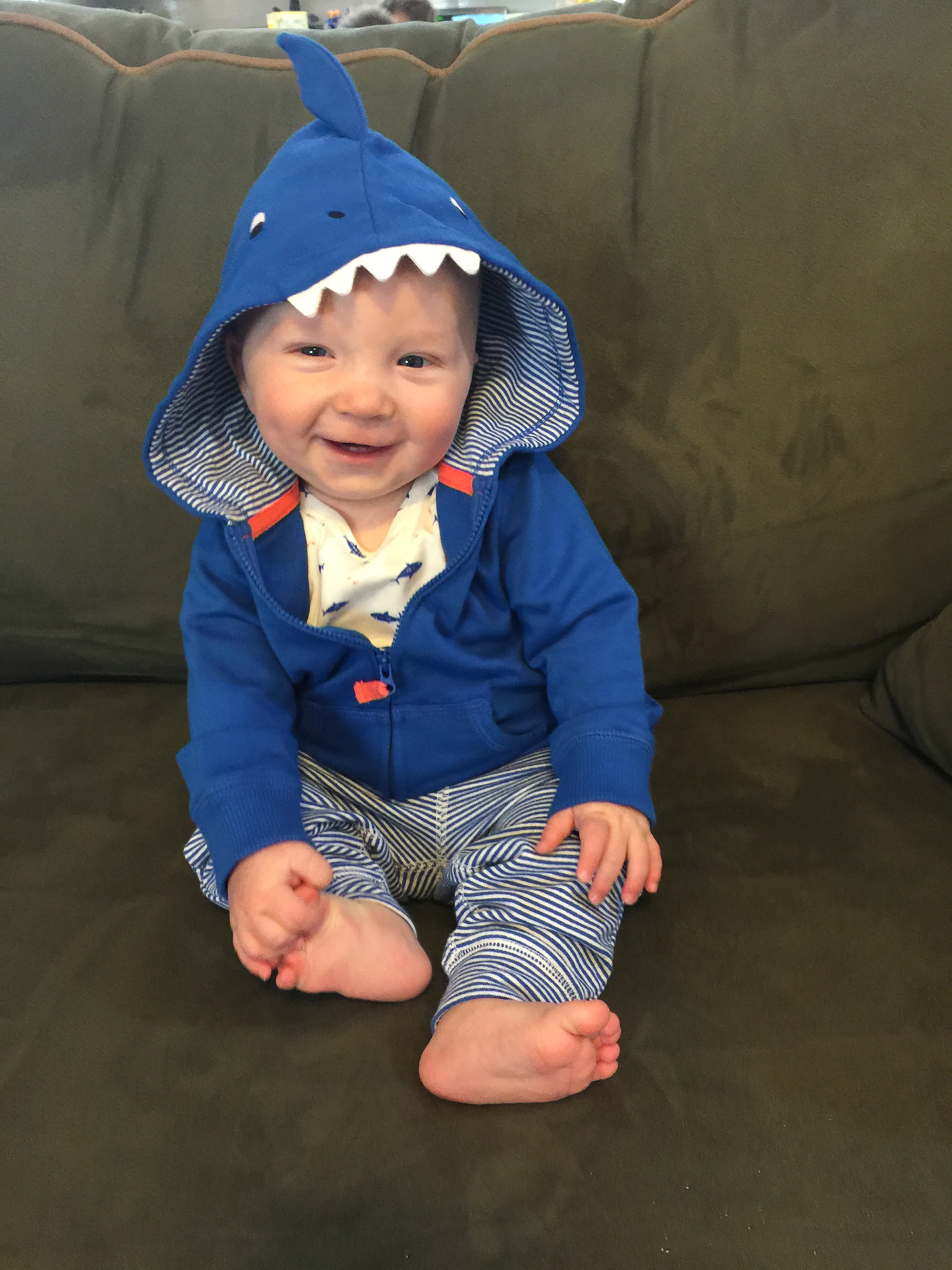Your first two teeth are in! It’s time to bite, so the baby shark outfit seemed only appropriate for a picture. You’re ready to use those things as a force for good. Still, you should probably lay off of Mommy.