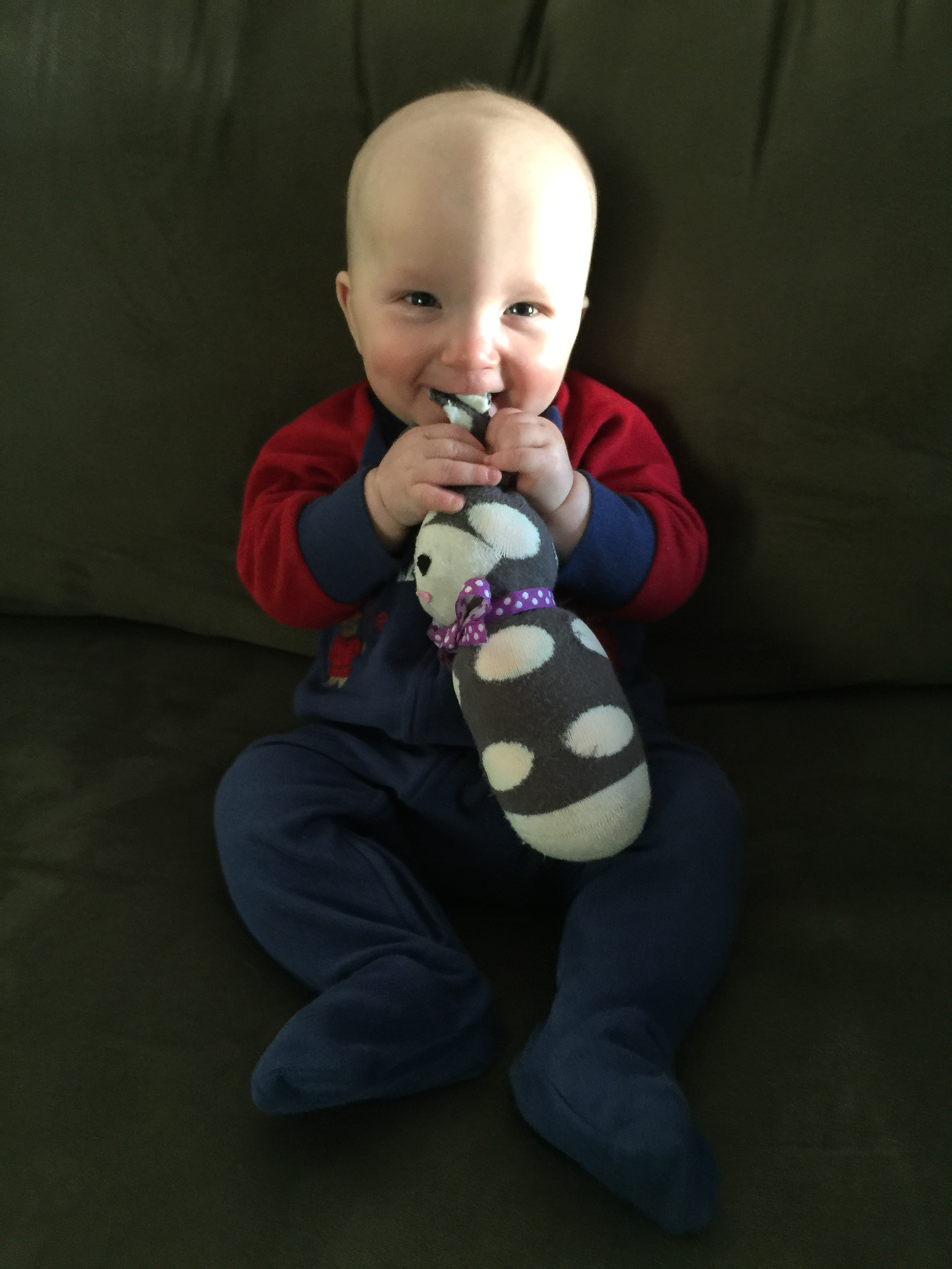 Man, things are getting crazy at this house! You are on the move, going from rolling all over the place, to getting up on those hands and knees, to the army crawl/scoot. Nights in the crib involve lots of rocking practice on your hands and knees, while you figure out just exactly how to move those four extremities together for maximum effect. The last week or so has also brought little hops to your hands and knees, and some individual knee work. You’ve also got the sit-to-knees transition worked out, along with just sitting in place to play with toys without immediately falling over backwards.