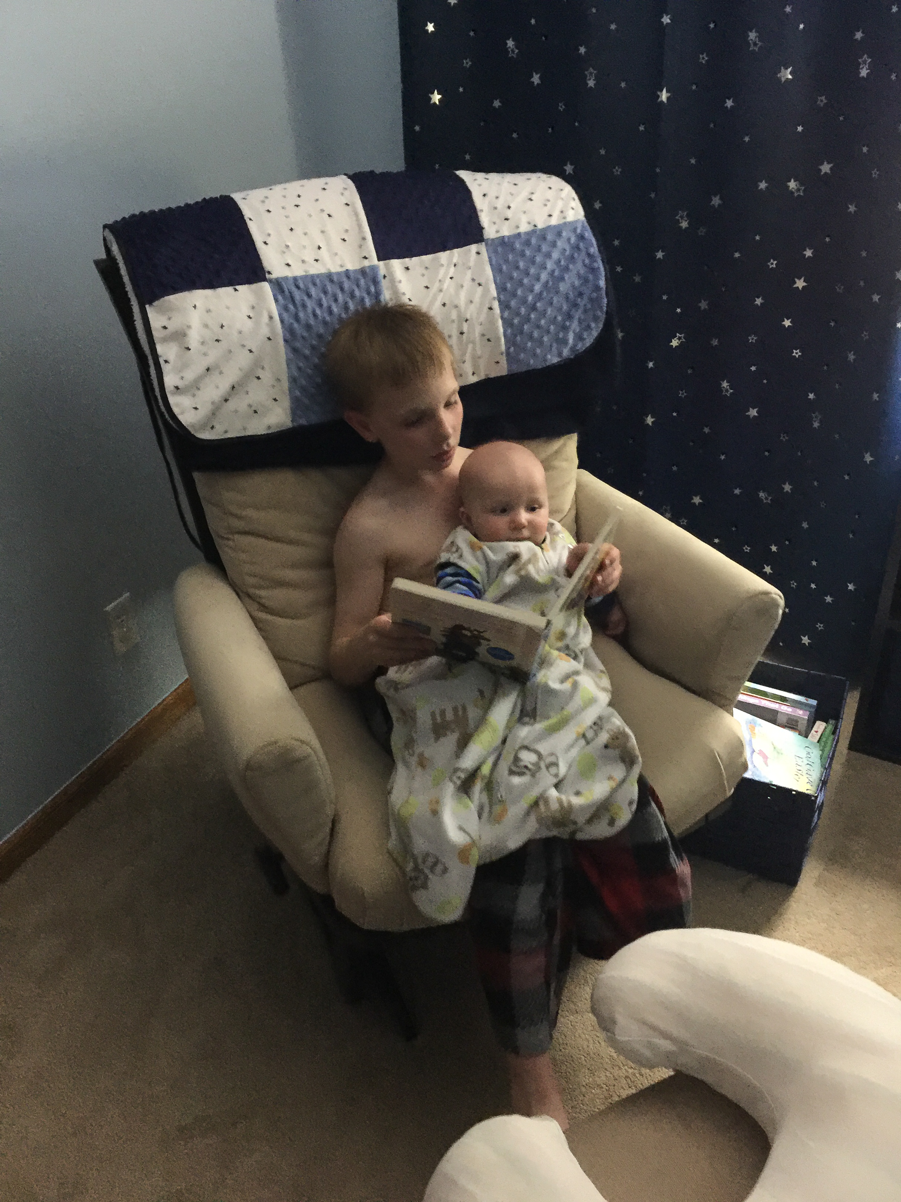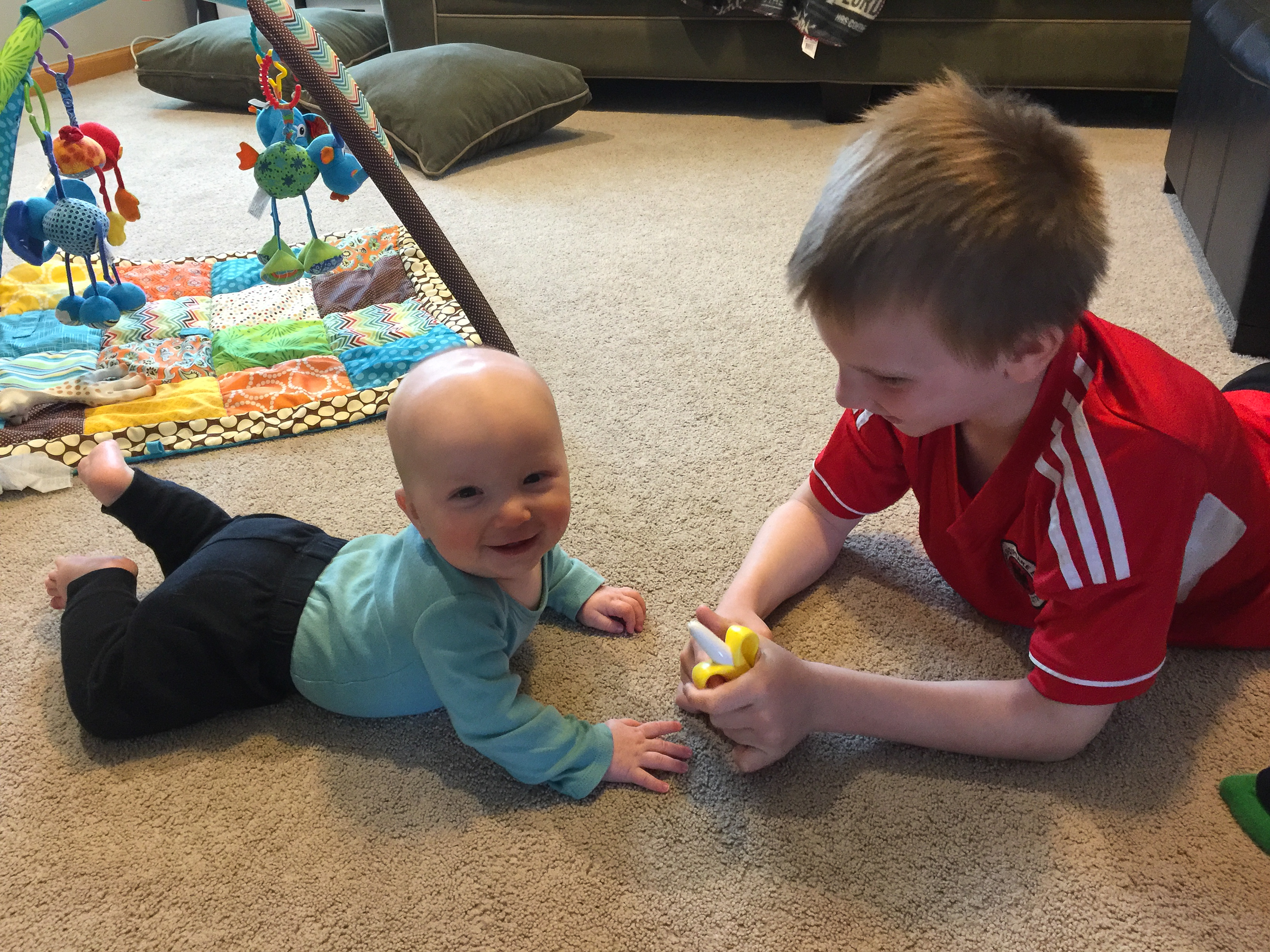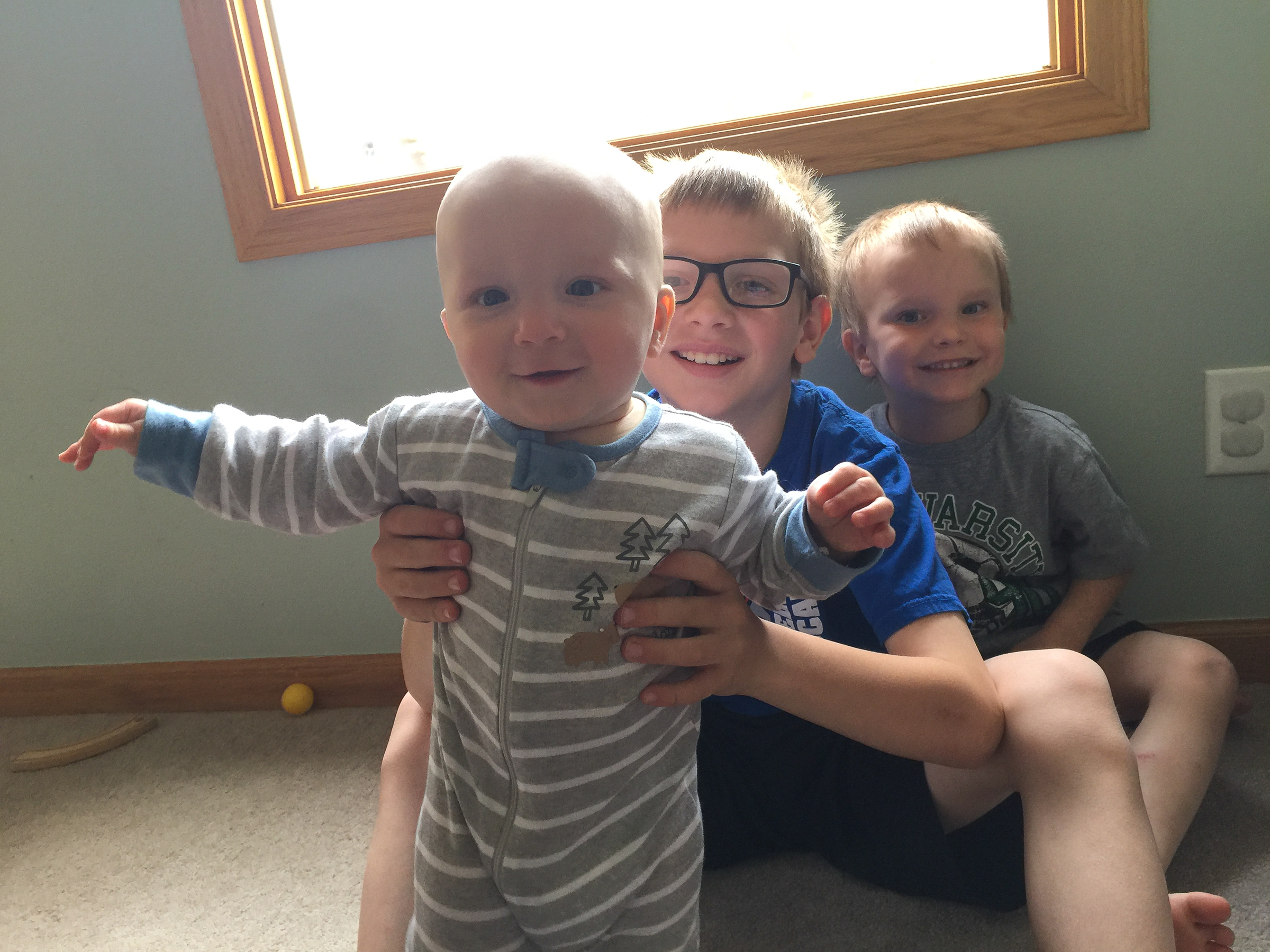 The boys love you more each day as you start to move and crawl. They put out toys and watch you excitedly work your way over to them, celebrating those little victories with you. As I write this, they are surrounding you on the floor, playing and laughing together. Noah always makes sure to bring your a toy, your wubbie, or a blanket. Seth now snuggles with you in the rocking chair at night and reads you bedtime stories. Seth and Noah are the big brothers you will always be thankful to have. (Even when Noah is roaring at you – that surprised you for a while, but now it generates smiles.)