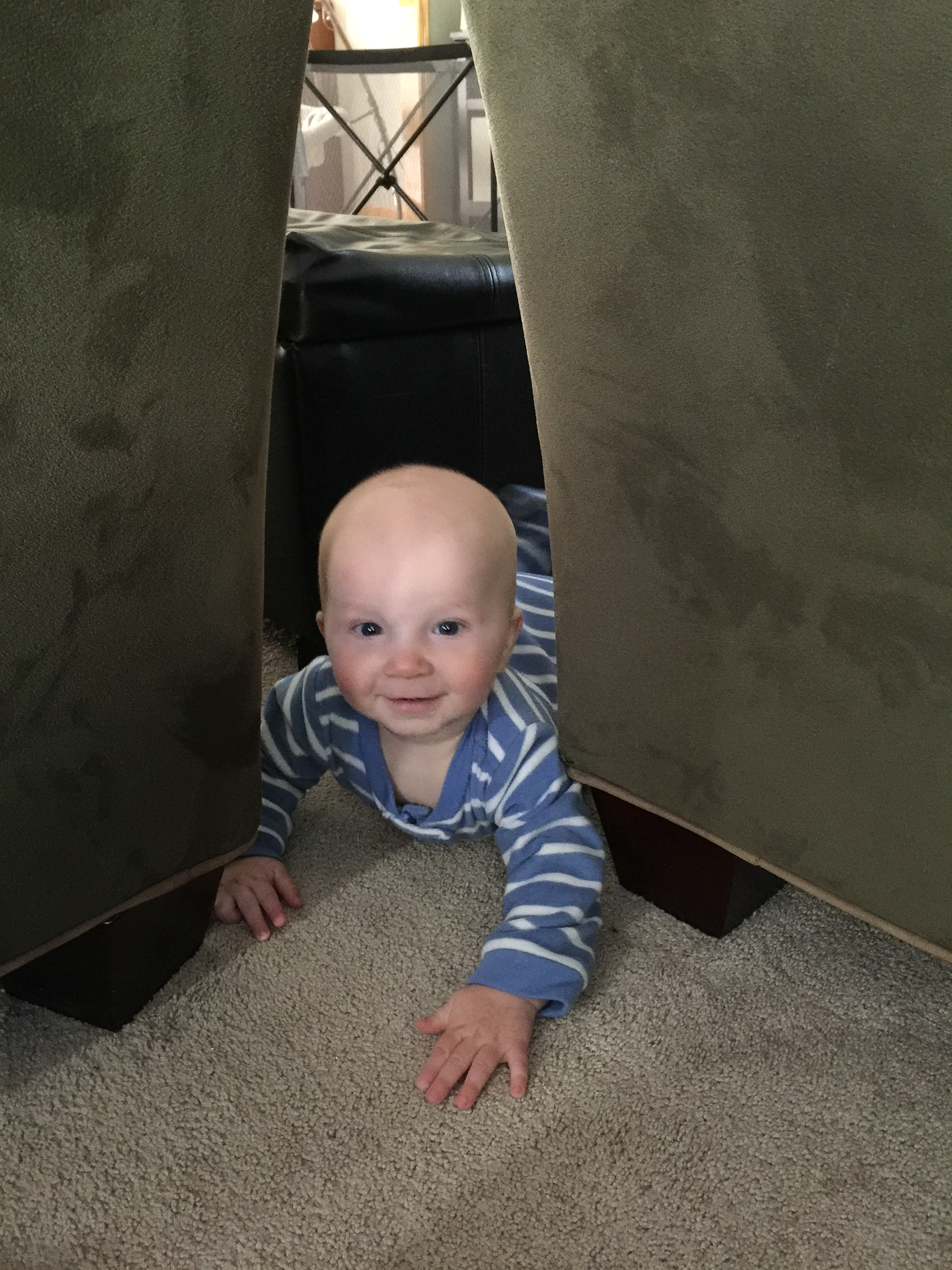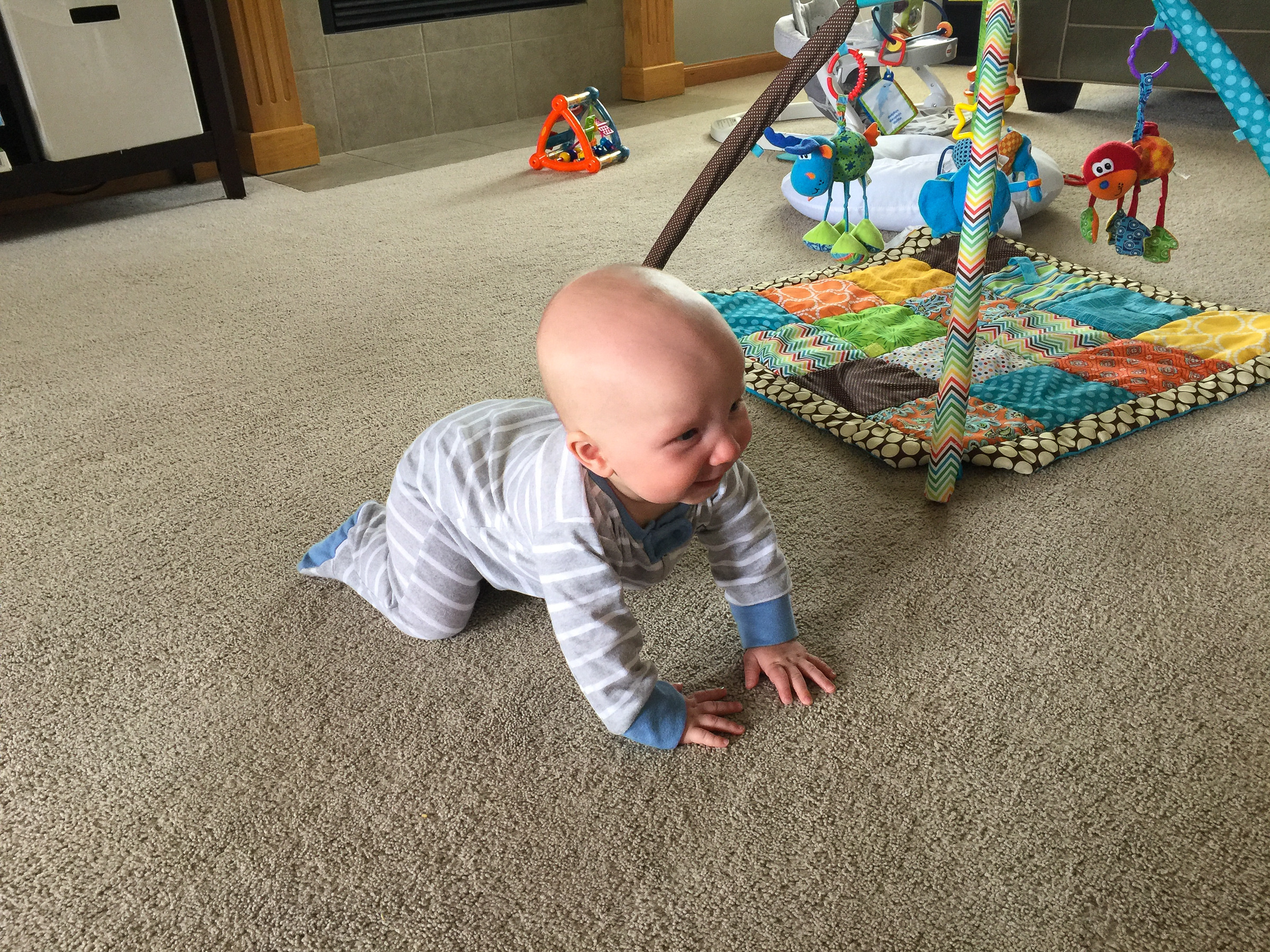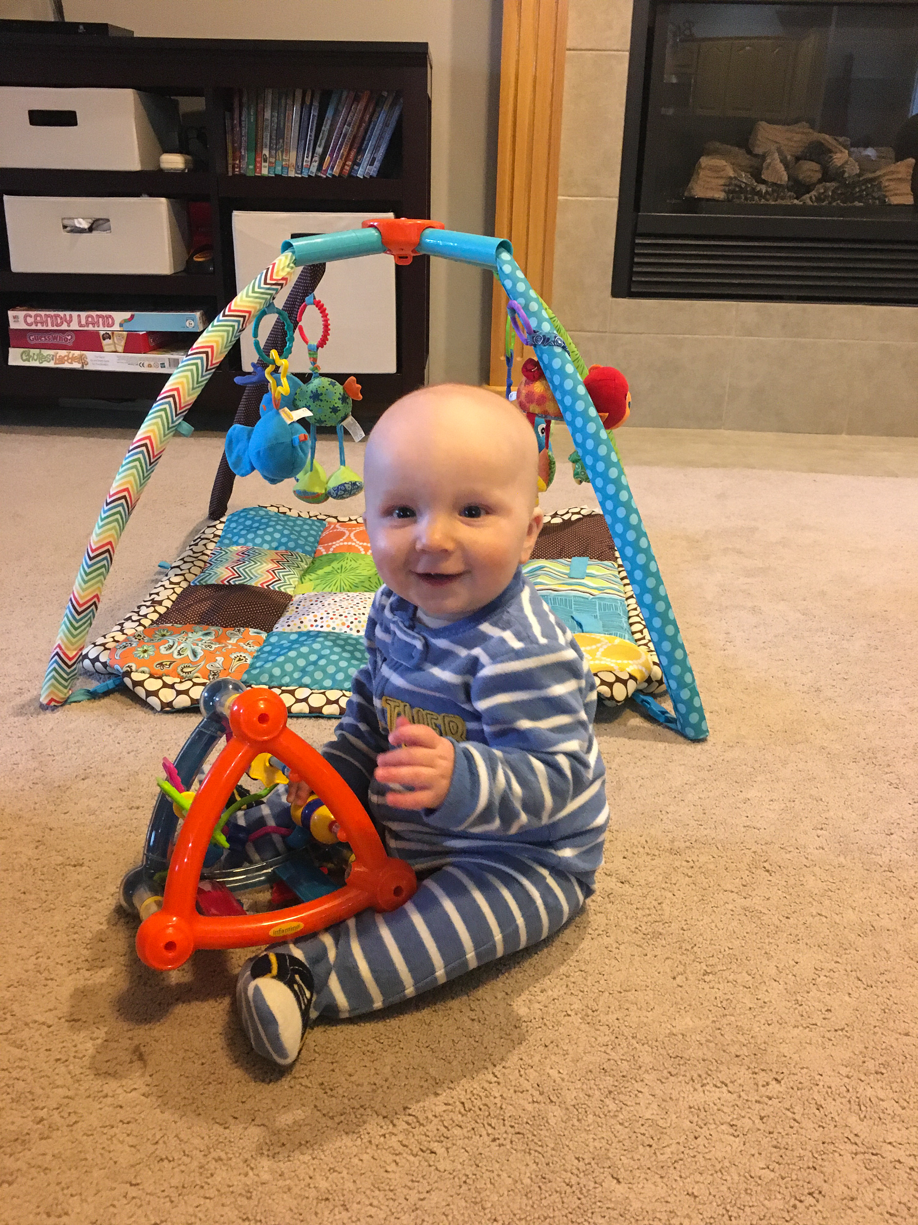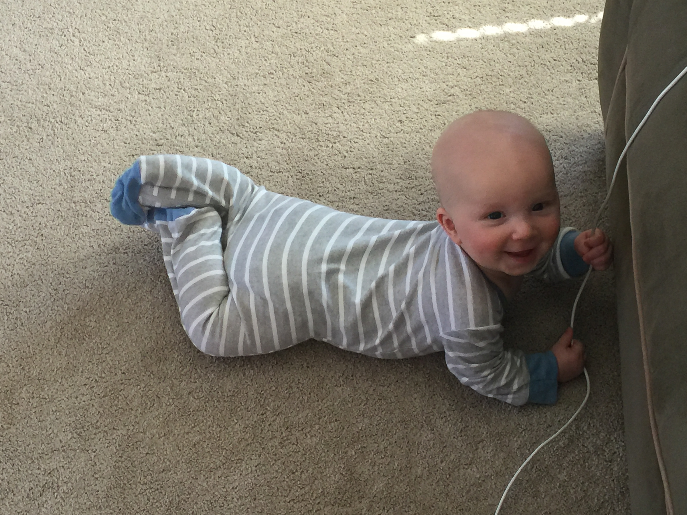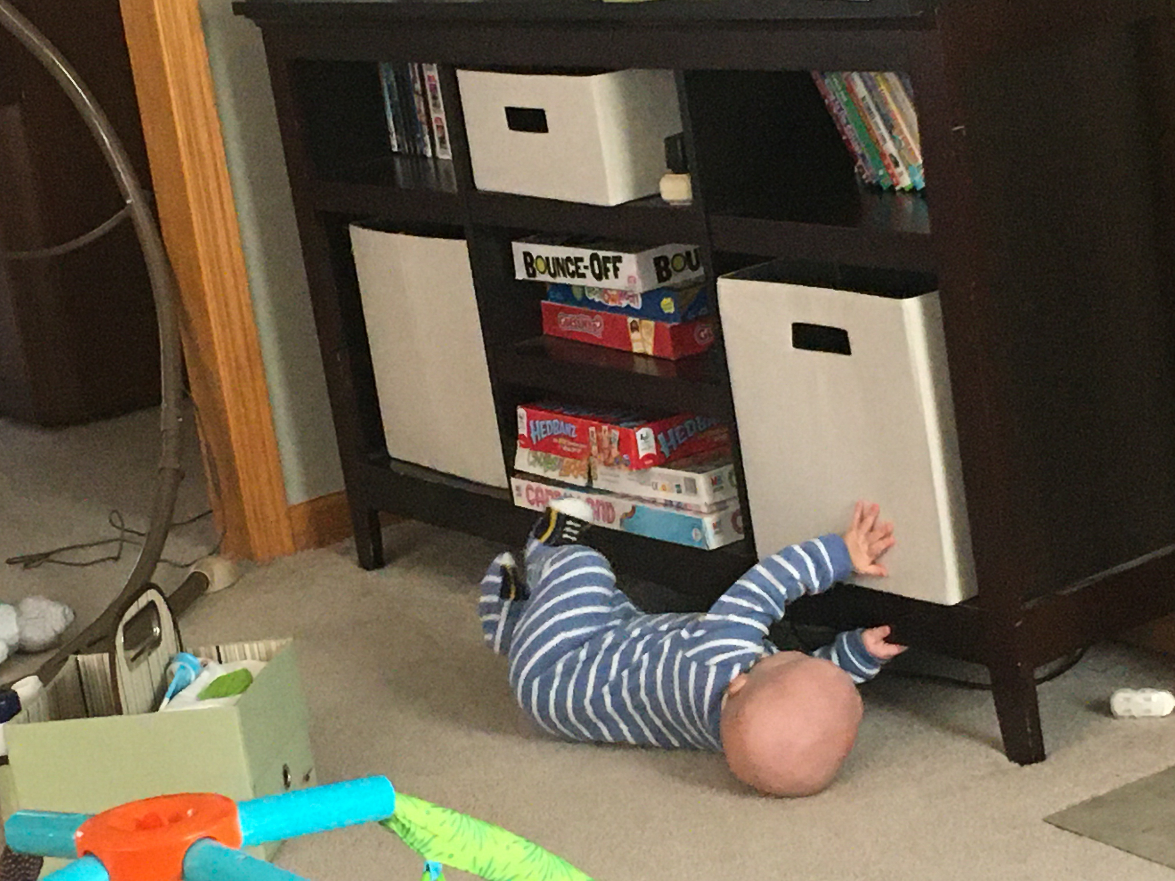 We all spent a good Saturday afternoon cleaning up the main level of the house and removing all the little pieces, parts, bits, bobs, and parts that accumulate when you have four and eight-year-old boys with toys. Of course, you made a beeline for Daddy’s laptop cable anyway. Despite you being number three to learn to crawl in our family, it’s so much fun to watch your process. You’re quite the roller, as well. For the longest time, you’ve been frustrated by rolling over against the support of the playmat. However, between your core strength and 17 pounds of solid Witmer, you figured out that you can roll the playmat over with you. We also found you rolling over to the shelf to reach for the boxes and bins, just like your brothers did.