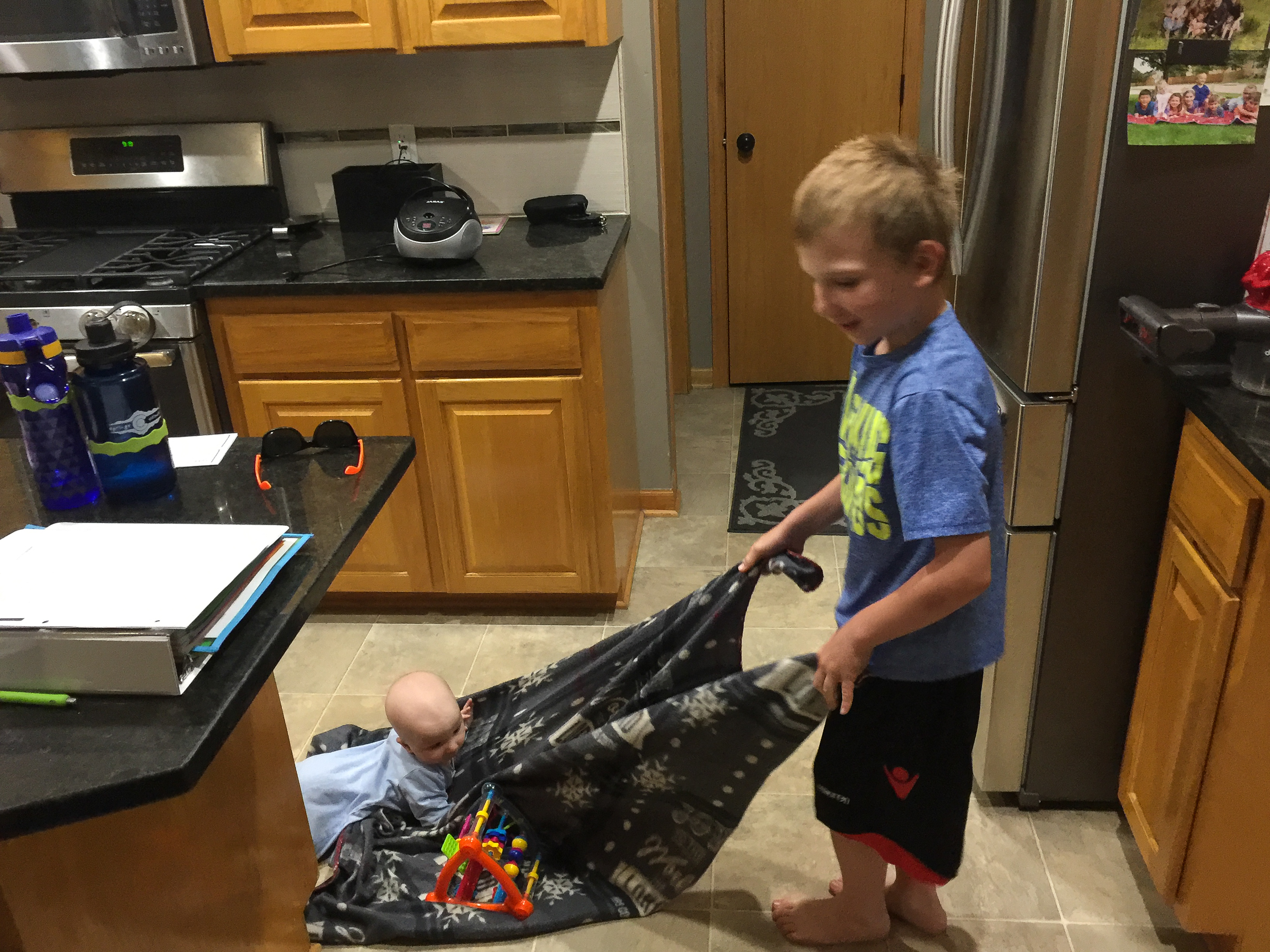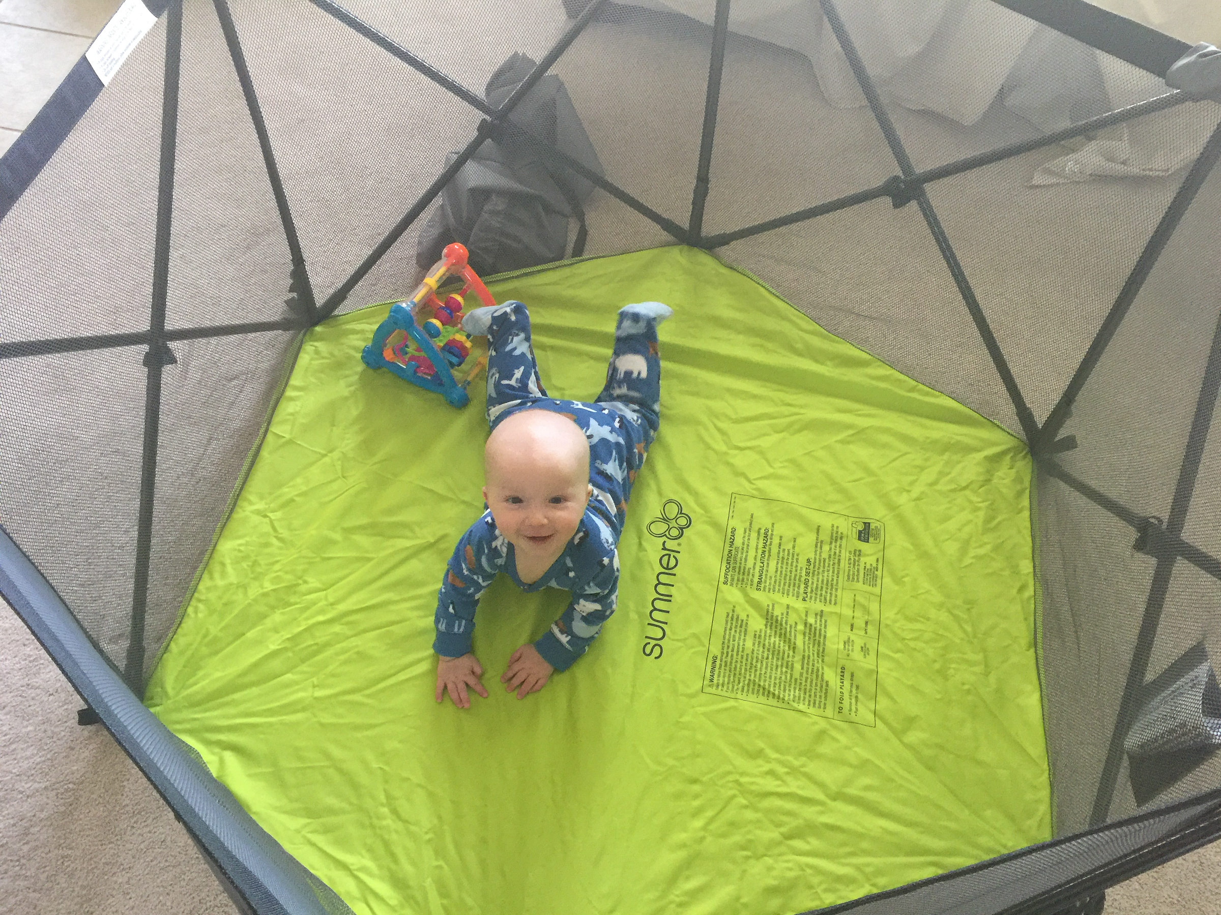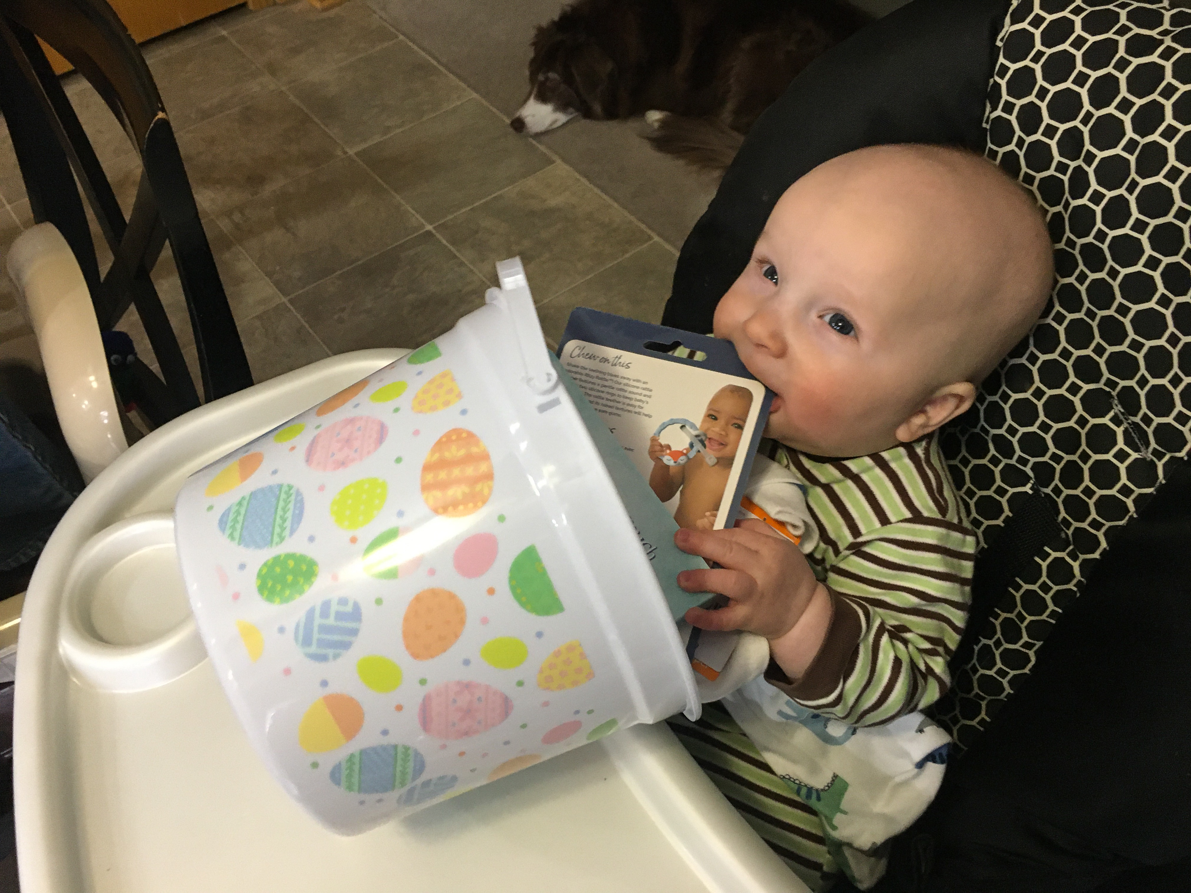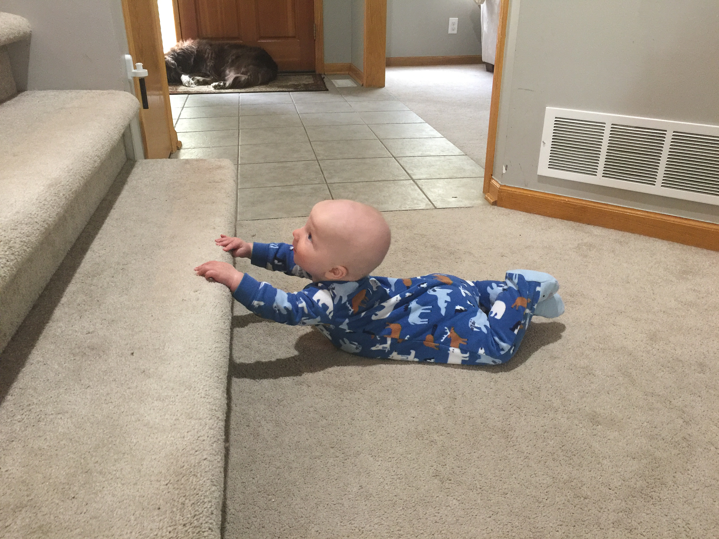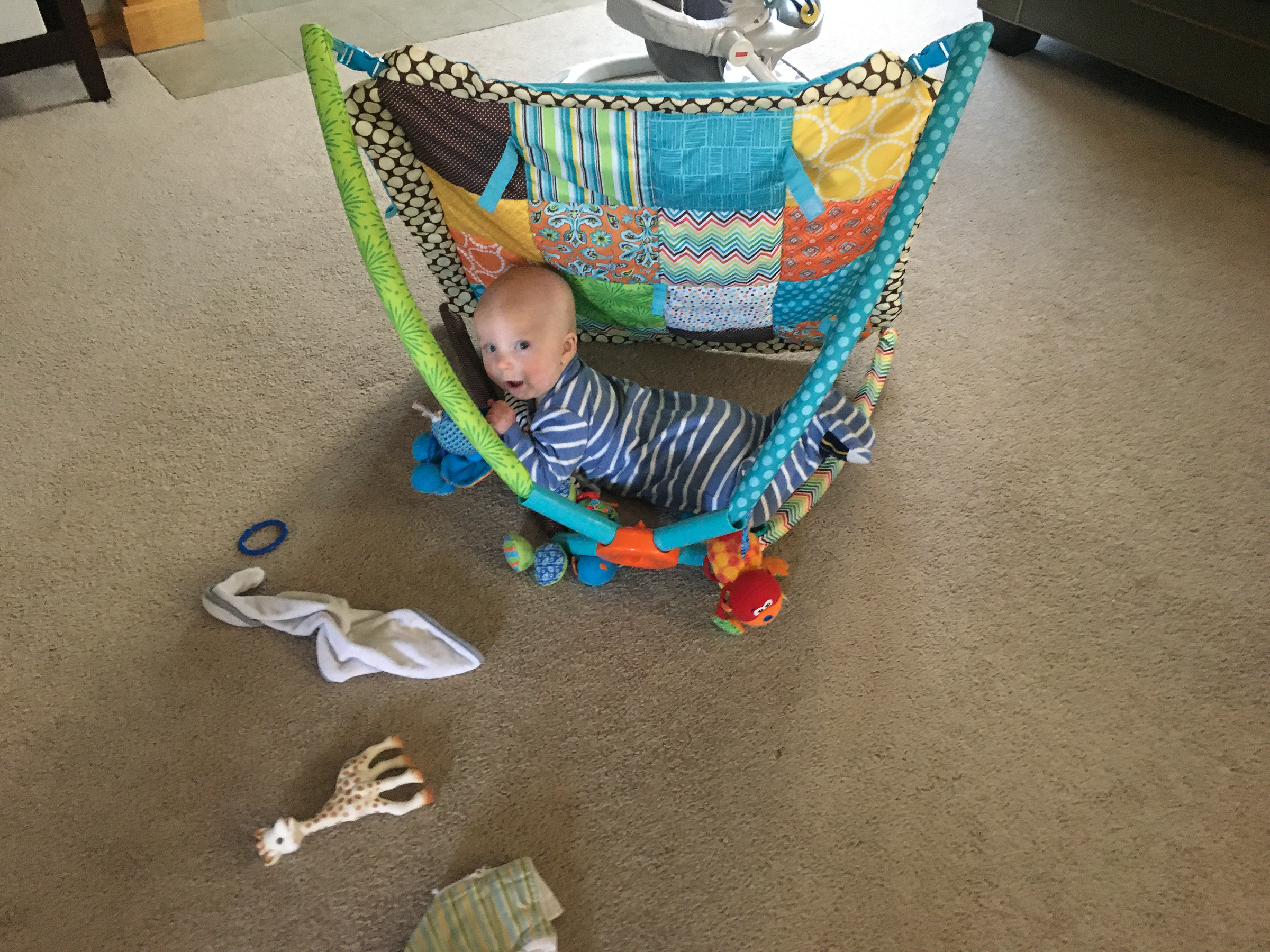 We all spent a good Saturday afternoon cleaning up the main level of the house and removing all the little pieces, parts, bits, bobs, and parts that accumulate when you have four and eight-year-old boys with toys. Of course, you made a beeline for Daddy’s laptop cable anyway. Despite you being number three to learn to crawl in our family, it’s so much fun to watch your process. You’re quite the roller, as well. For the longest time, you’ve been frustrated by rolling over against the support of the playmat. However, between your core strength and 17 pounds of solid Witmer, you figured out that you can roll the playmat over with you. We also found you rolling over to the shelf to reach for the boxes and bins, just like your brothers did.