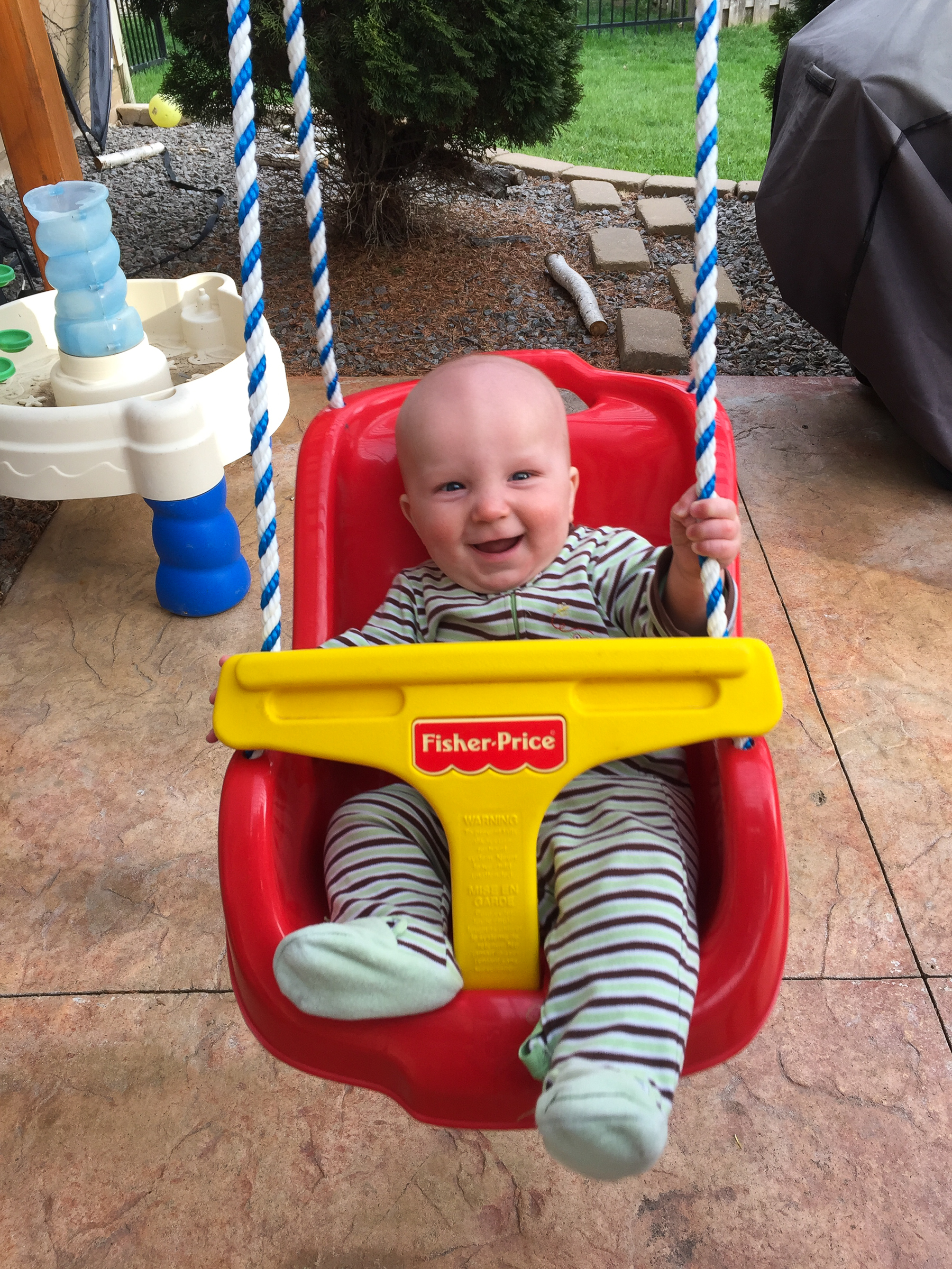 We’re up to three teeth now. That third tooth was in and out for a little while, but it’s there, and you’re on a roll. We’re all in on eating all sorts of food. Bananas are currently your favorite. You like nothing more than to grab a big piece of banana and attempt to take bites out of it yourself (under close supervision). We’ve coined the term “first bite face” for the first spoonful of anything, as you adjust to the flavor, no matter if you’ve had it before. You recognize your bowl and spoon, and get so excited when we bring it to the table for you, rocking back and forth in the high chair. You’ve yet to show a more betrayed expression than when Daddy brought the bowl of food and spoon over to the high chair, set it down, and then WALKED AWAY to go get the rest of dinner.