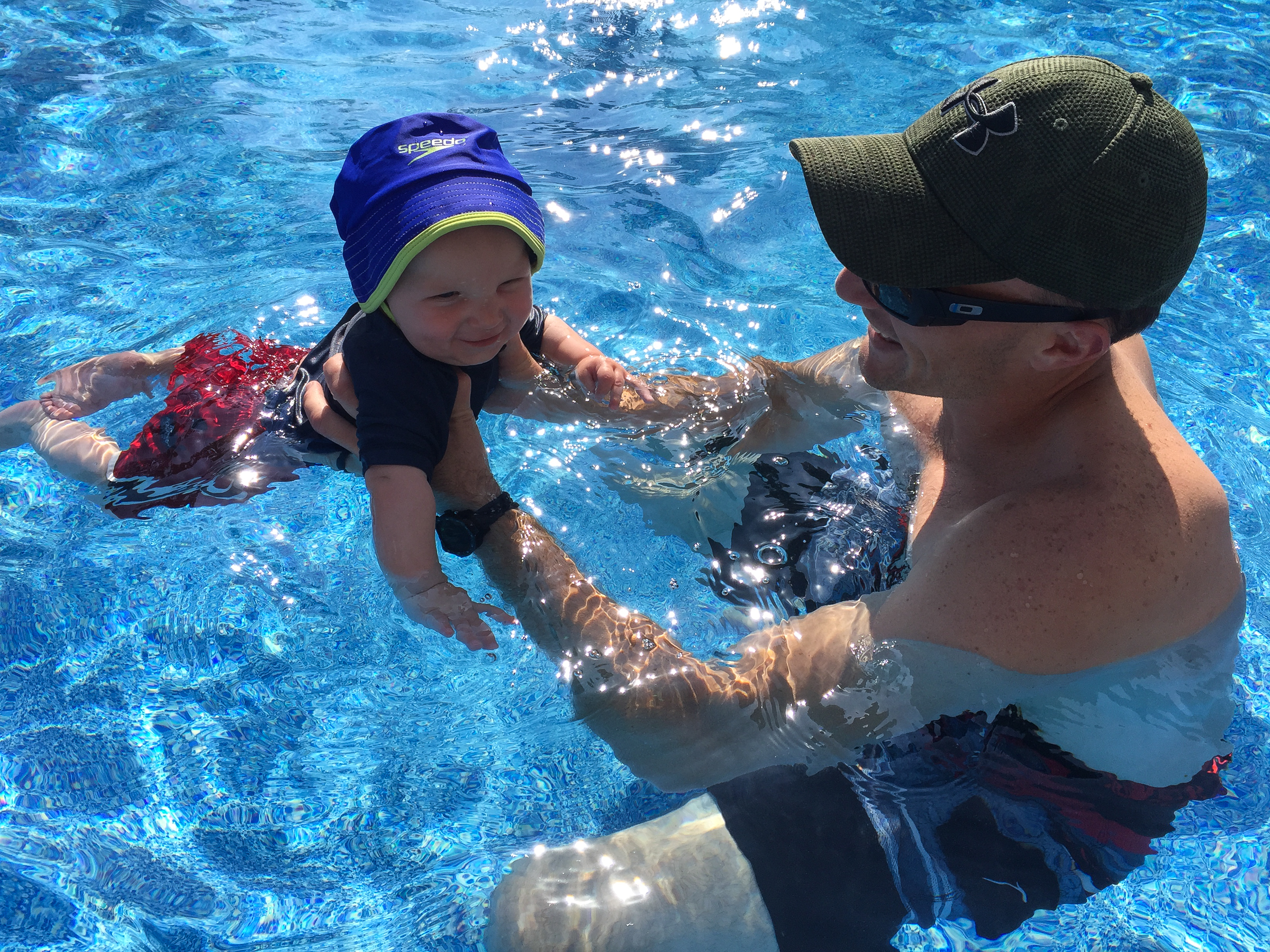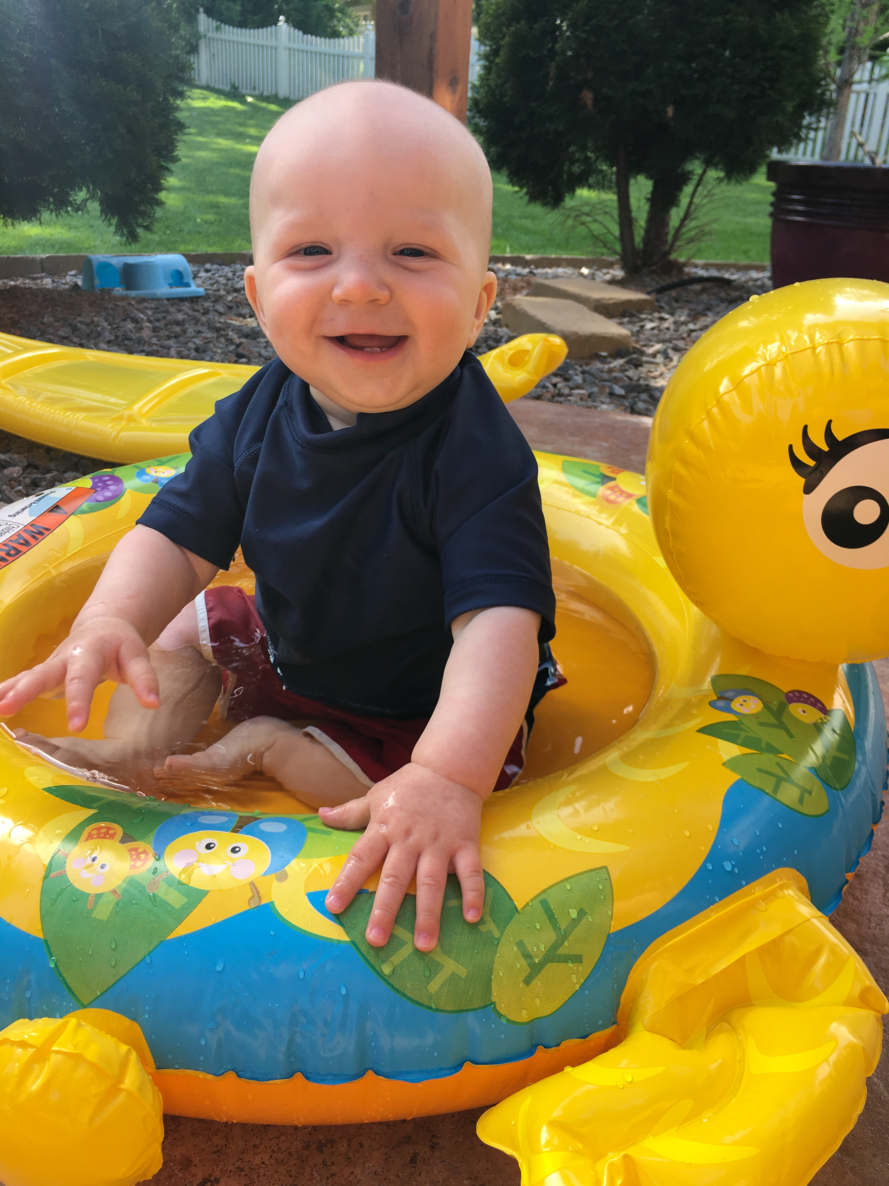 The temperature is going up, so it’s time for lots more water activities. Mommy got small and big baby pools for the back yard. Your brothers had a great time bringing down bath toys for you to play with. You got to go swimming for the first time in the pool at a friend’s house, as we helped them inaugurate their new backyard pool. Hot weather brought a few more trips to various backyard pools as well, and you’re all for swimming, just like your brothers.
