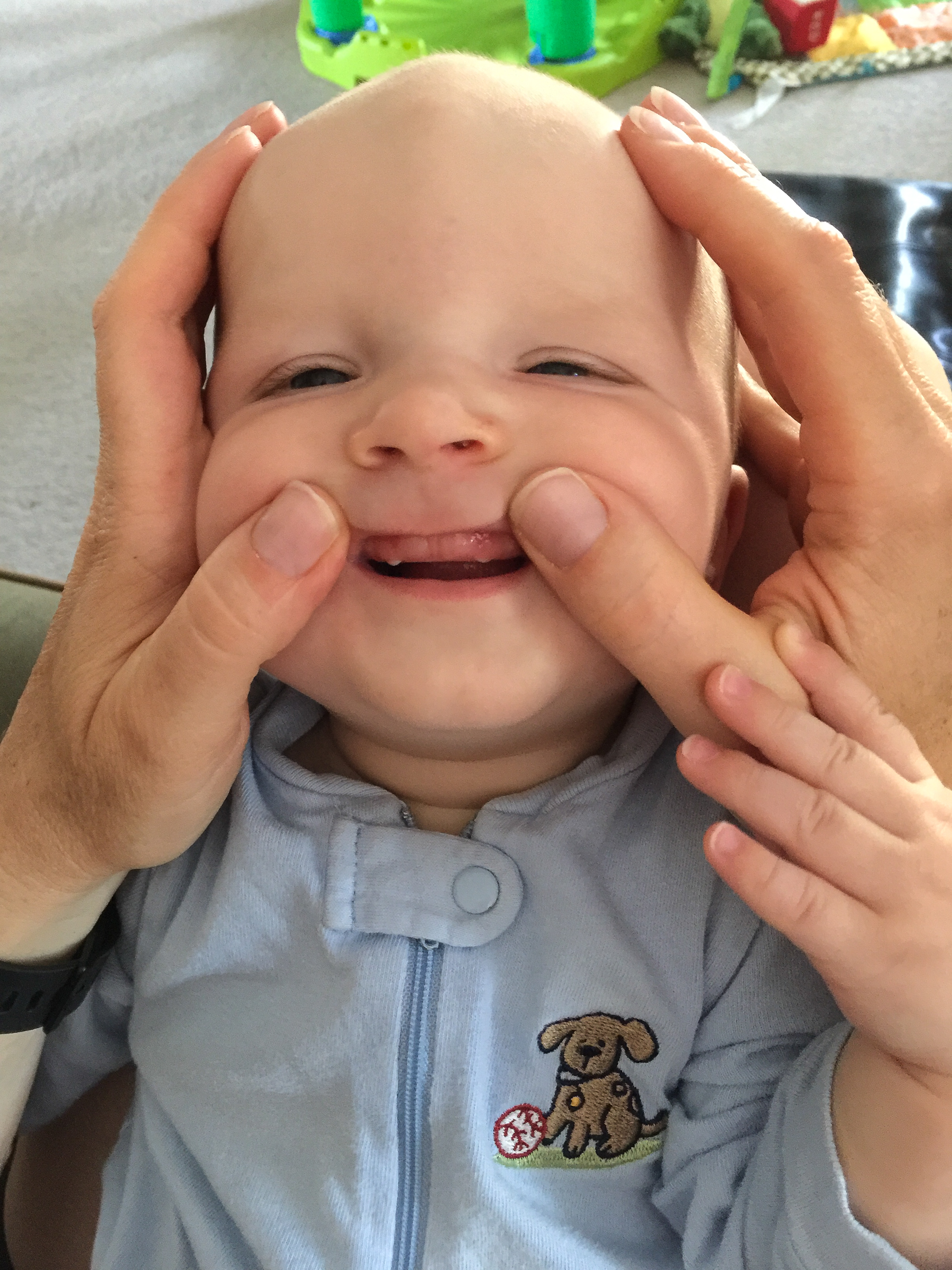 Solid work with the signs, as well. As best we can figure, “so big” actually means “more”, and whacking the tray with your hand means “all done”. Except for the times when “so big” means “all done”. The one sign that is unequivocal is “milk”. You’re 100% sure on that one, when it’s your time to nurse with Mommy. That means it’s time to go up to your room, sit in your rocker all by yourself, and snuggle with Mommy. Those four teeth brought a short nursing string and lots of pain, but the cute vampire look is pretty cute.