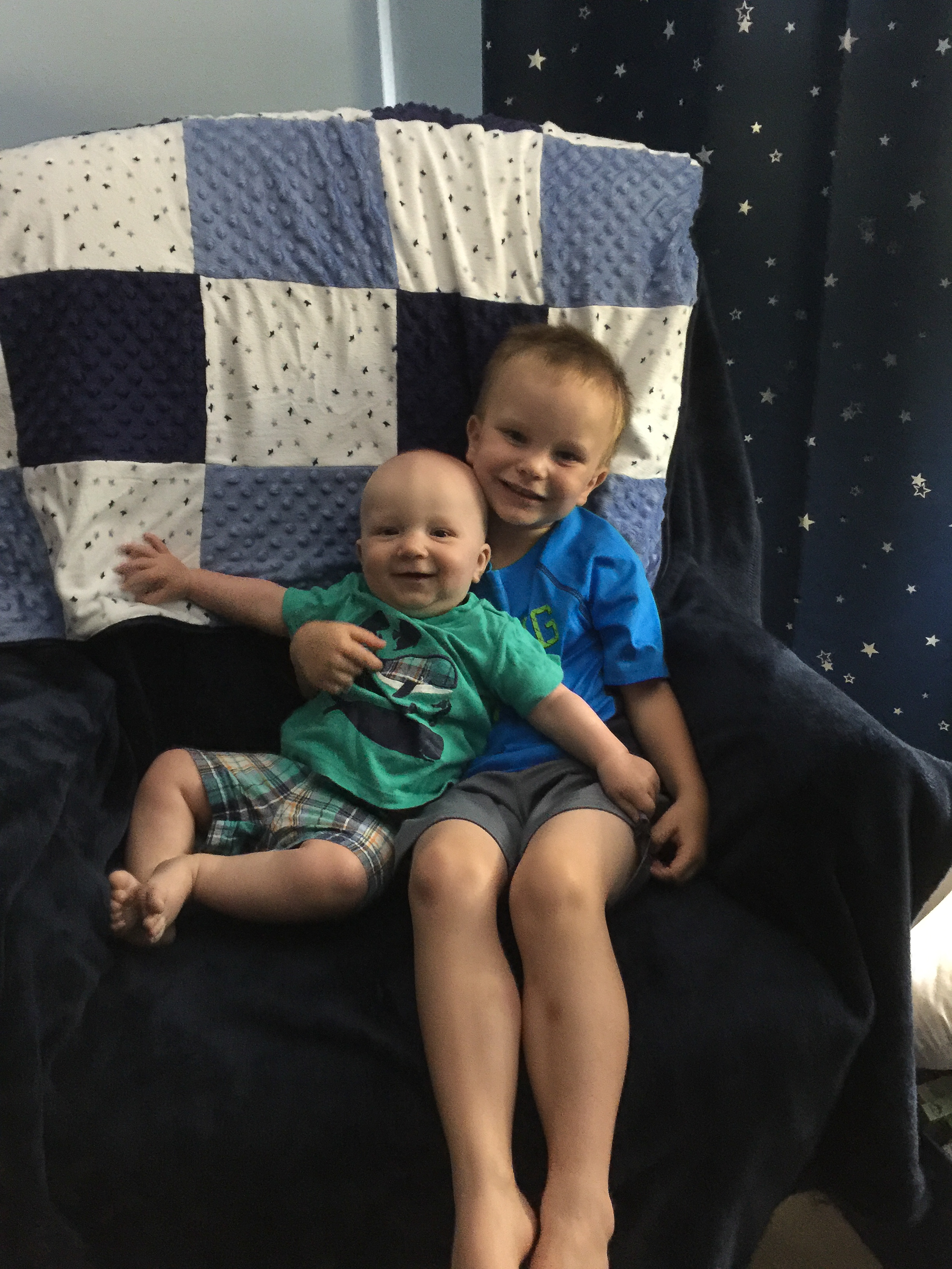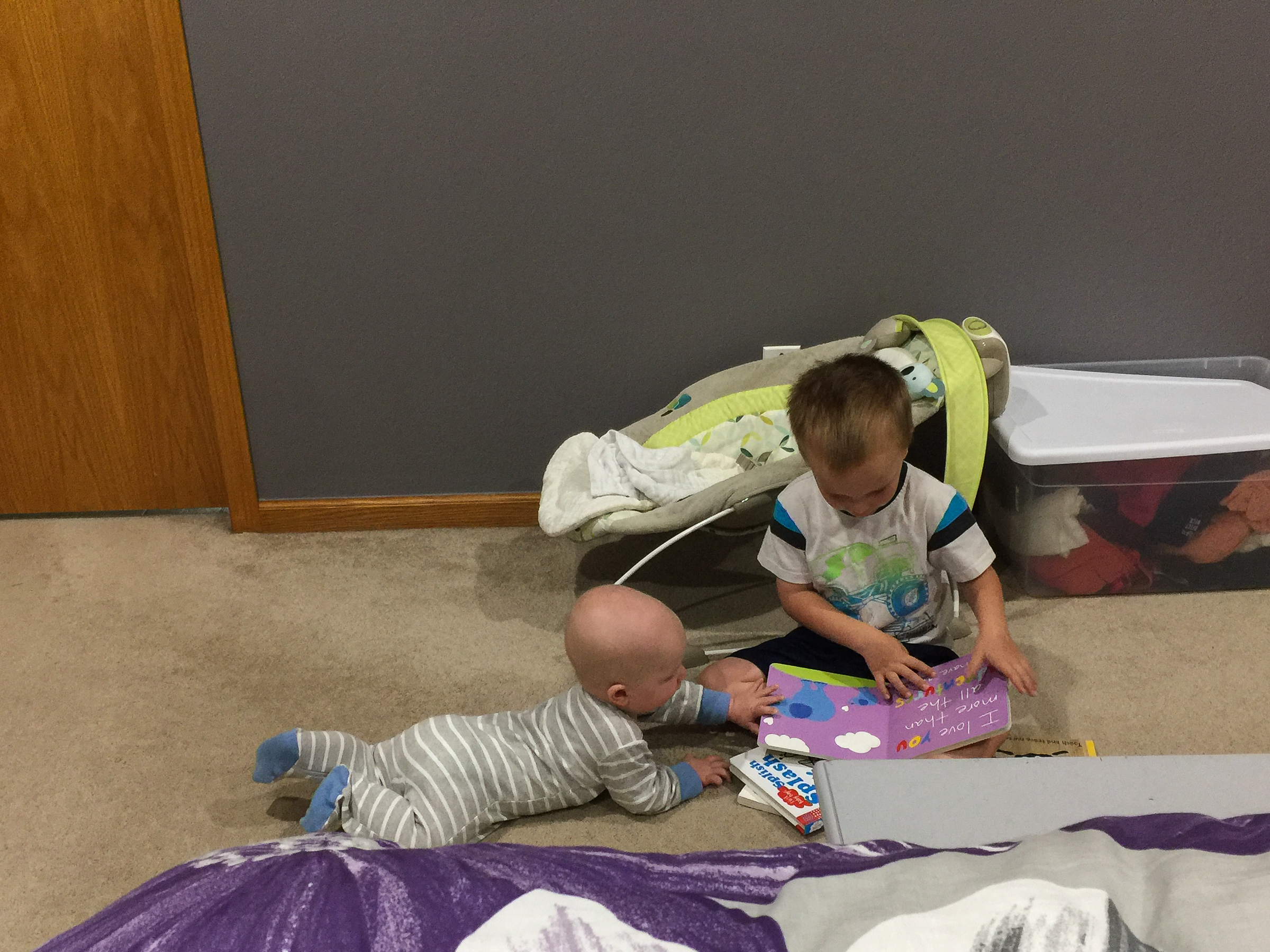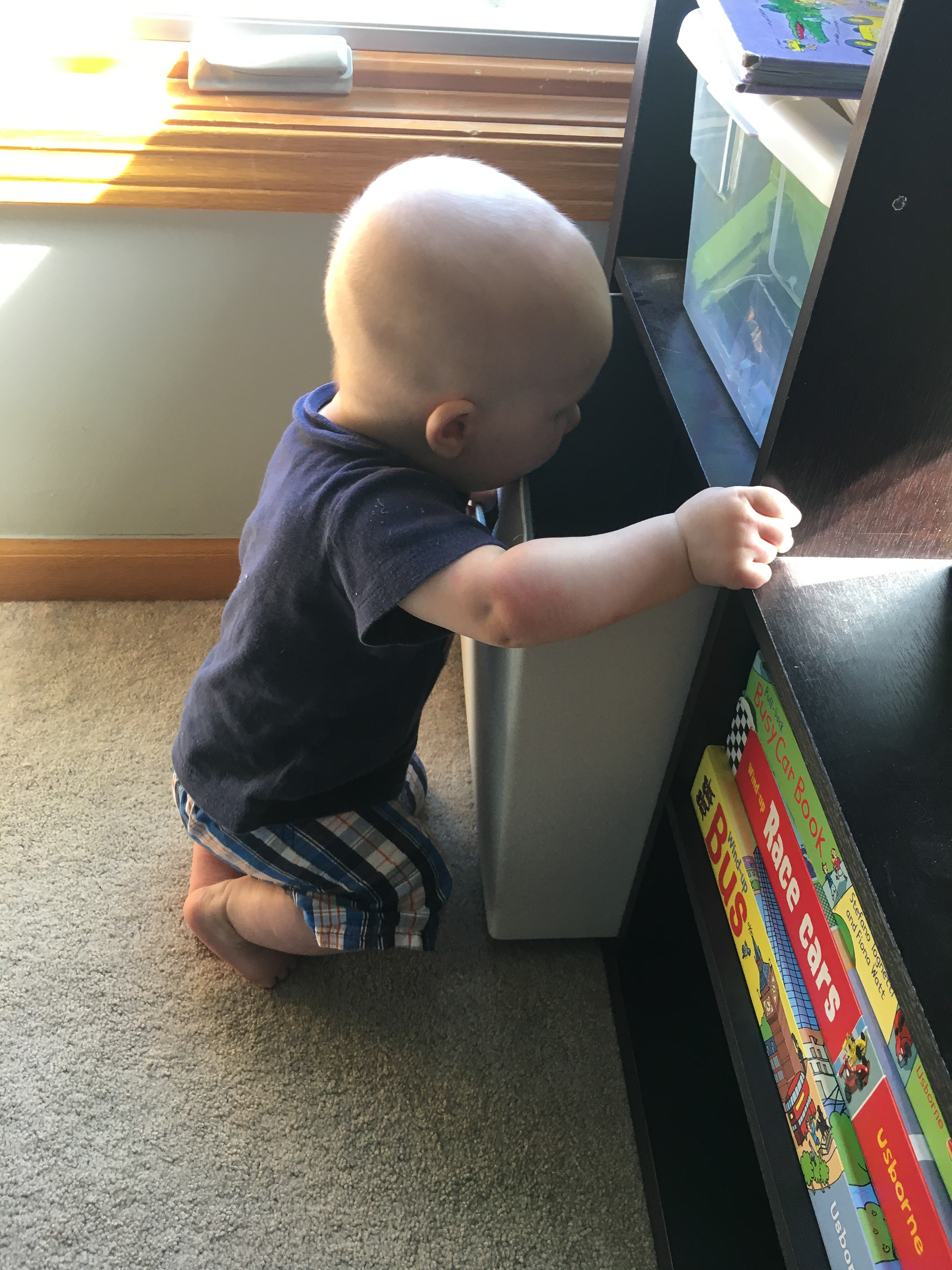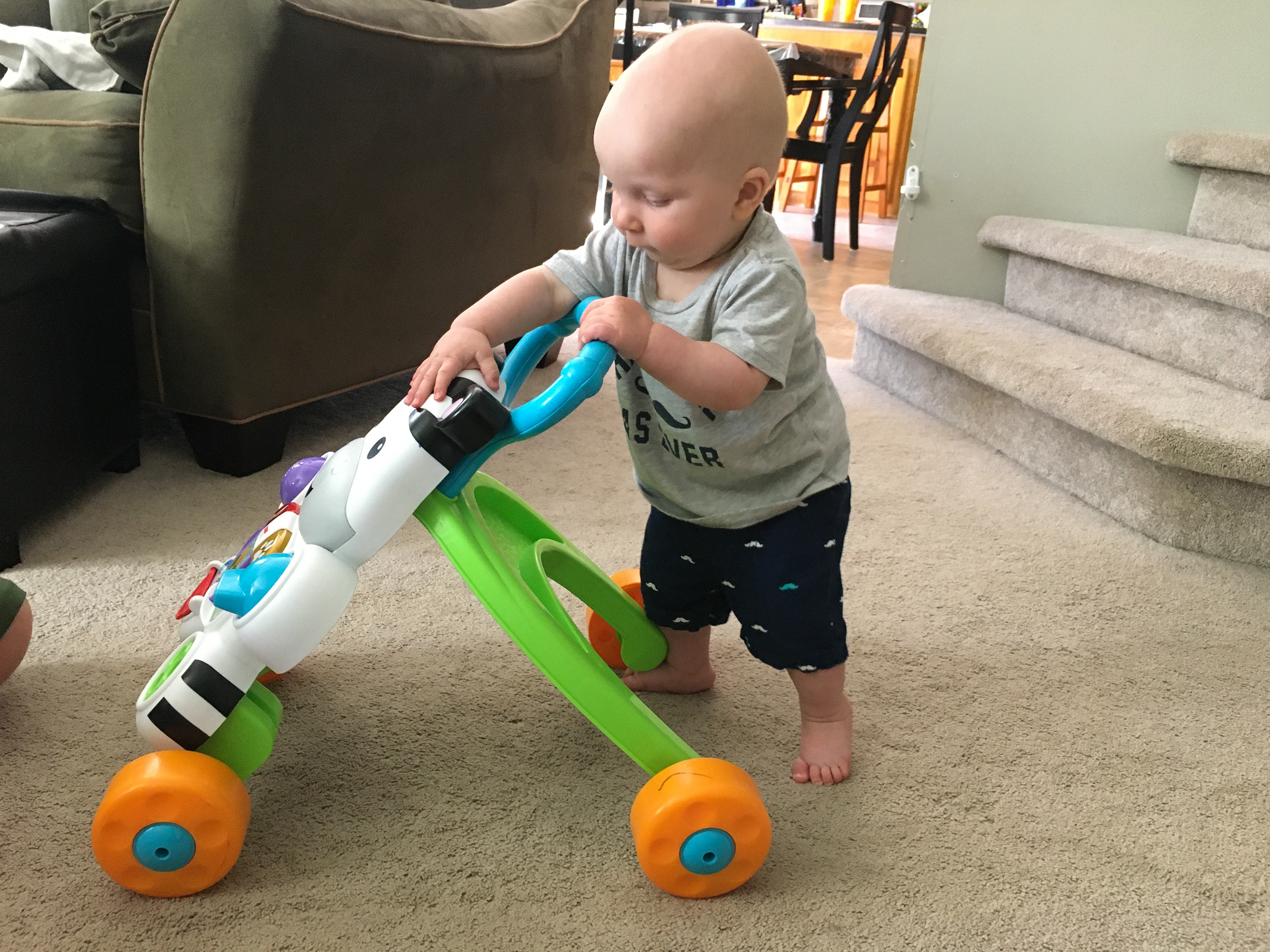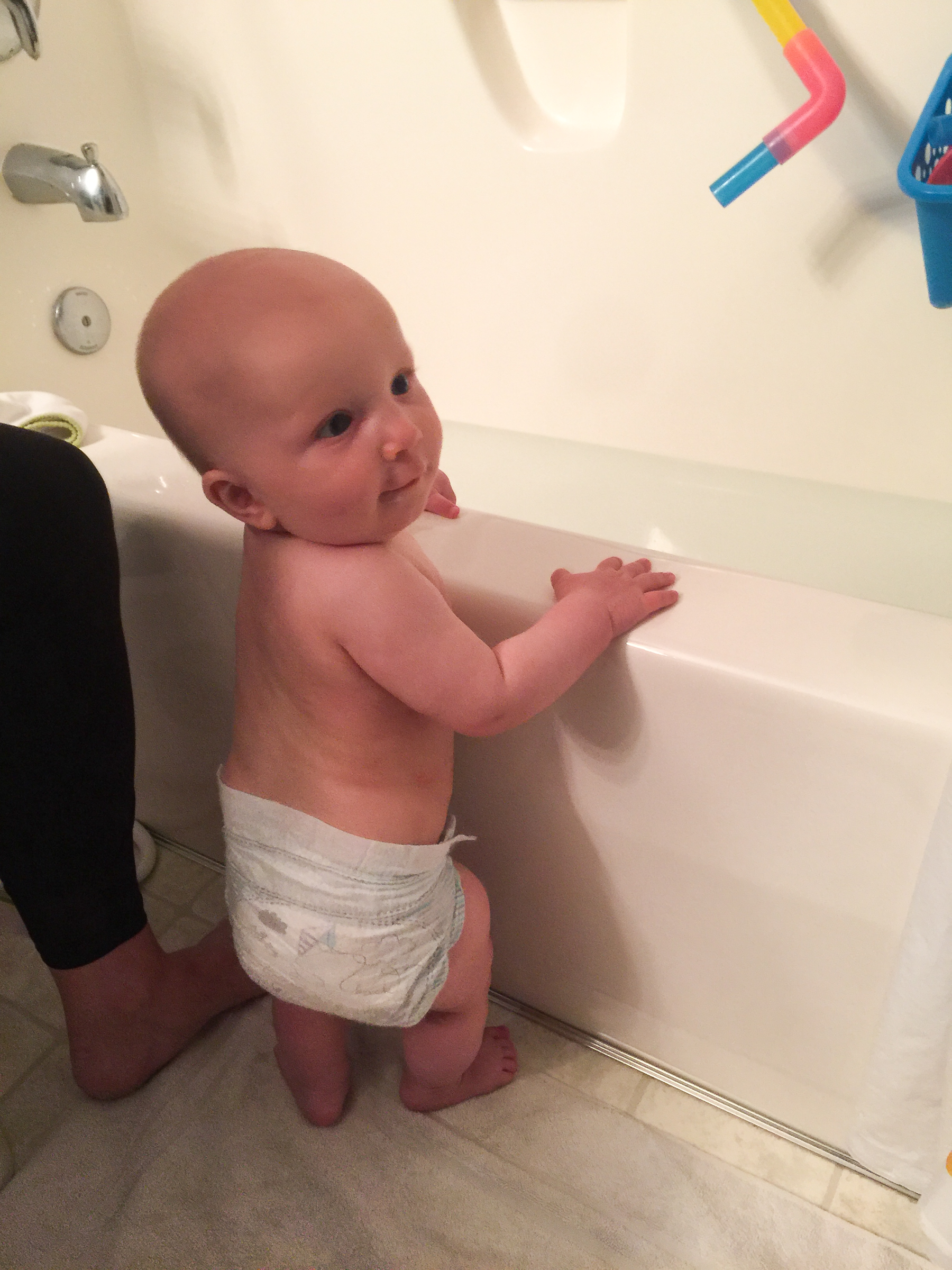 Whether it’s the changing table or the floor, we can’t change you without you spinning around, turning over, or trying to crawl right off the changing table. Laps mean you want to stand and hop, and if we wanted the floor clean, we’d attach a broom to your outfit. The boys are absolutely loving watching you get faster and more adventurous about exploring the house. You’re crawling through, over, under, and around everything, from the high chair to the exersaucer. If given an option, you’re making a beeline for the heater or air return grates to make some noise. And that failing, you’ll just pipe up with a few excited squeals to add to the baseline family noise level.