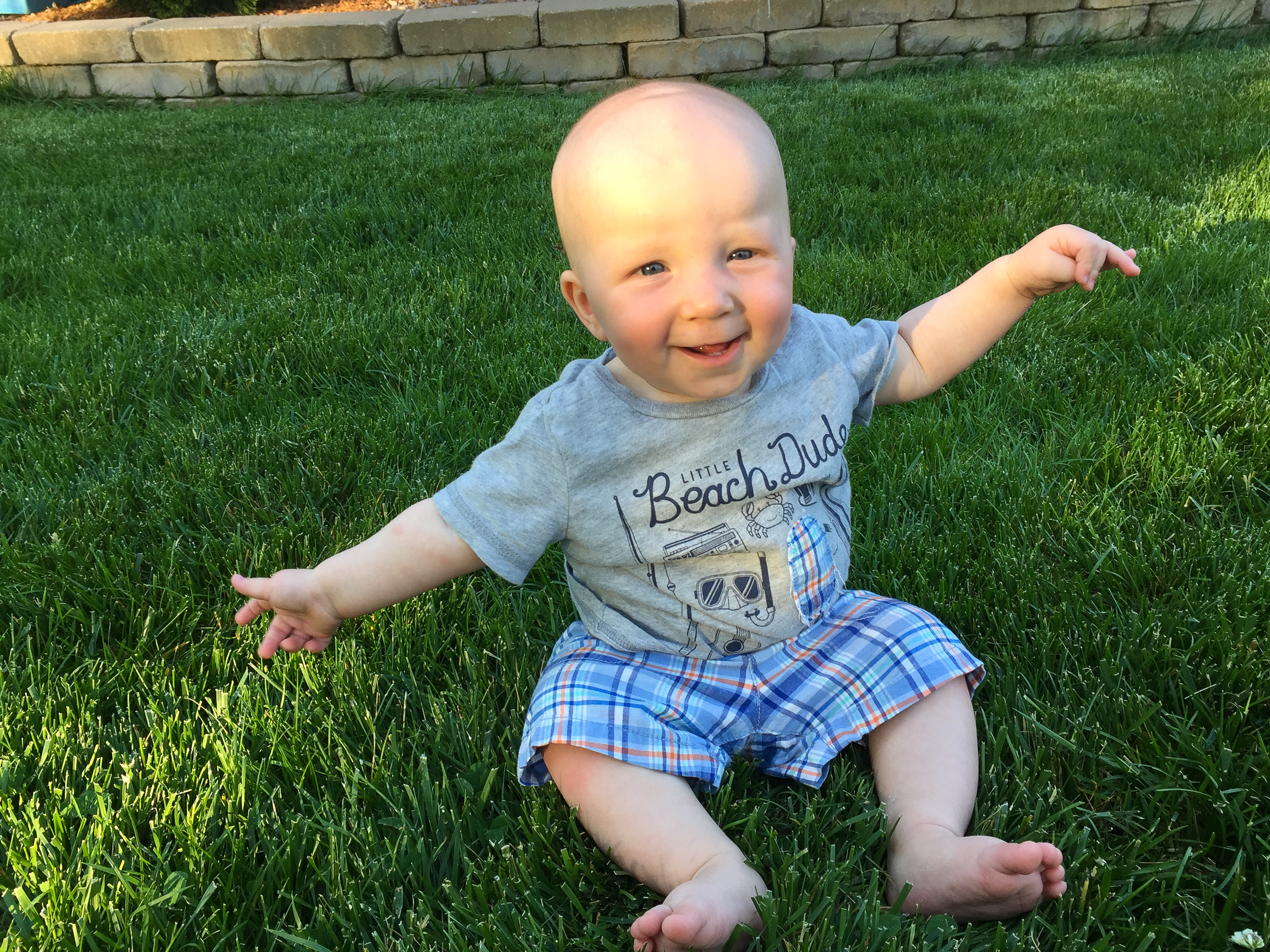 We’re having some trouble pinpointing your first word, since you’ve been mimicking sounds for quite a while. “Mama” has been in your sound repertoire for months already. This month has brought a number of new mimics, including “love you”, “brother”, and “up”. We definitely know you know what “up” means, with arms stretched up to Daddy & Mommy for pickups. As for the other words, we’re not totally sure that you know what they mean, but it’s cute to hear you trying. The newest sound is a kissing noise, which started showing up after you watched Mommy & Daddy kissing. That just gives us one more excuse to kiss. Can’t argue with that.