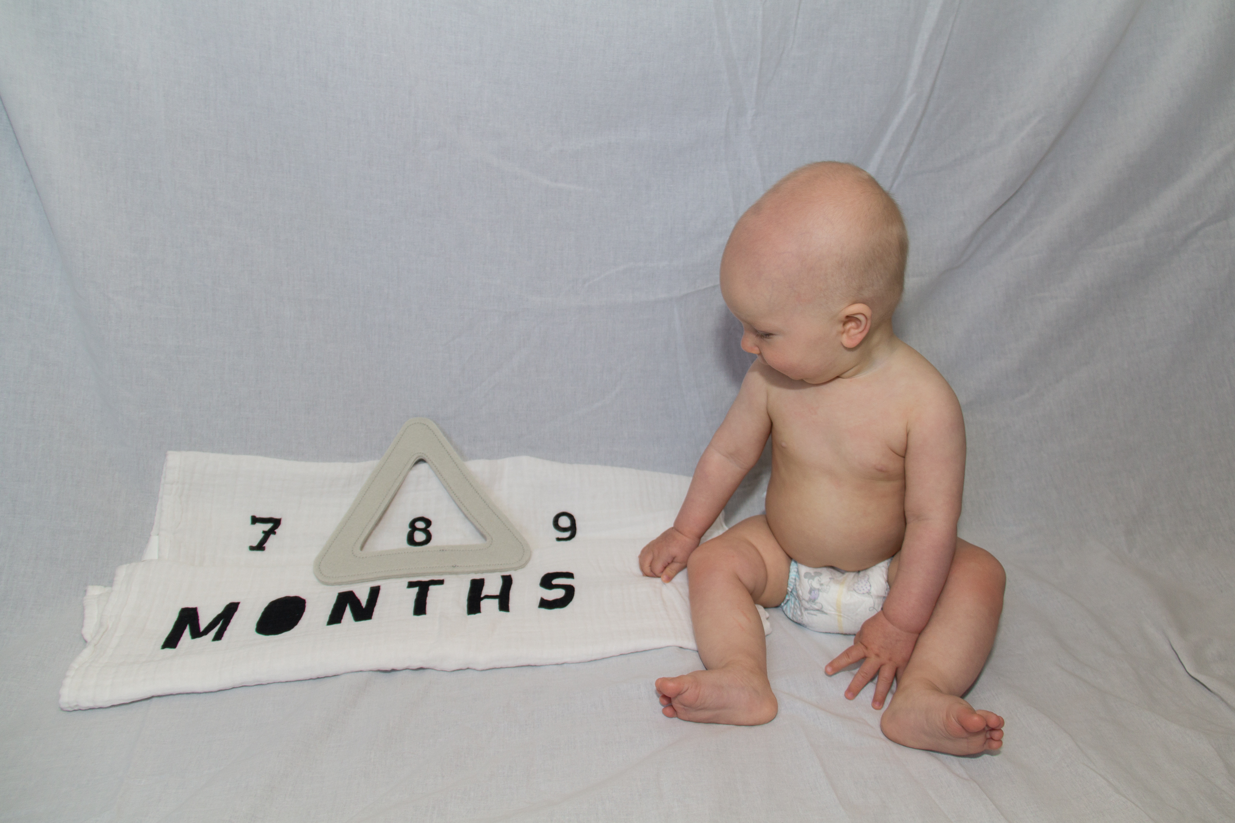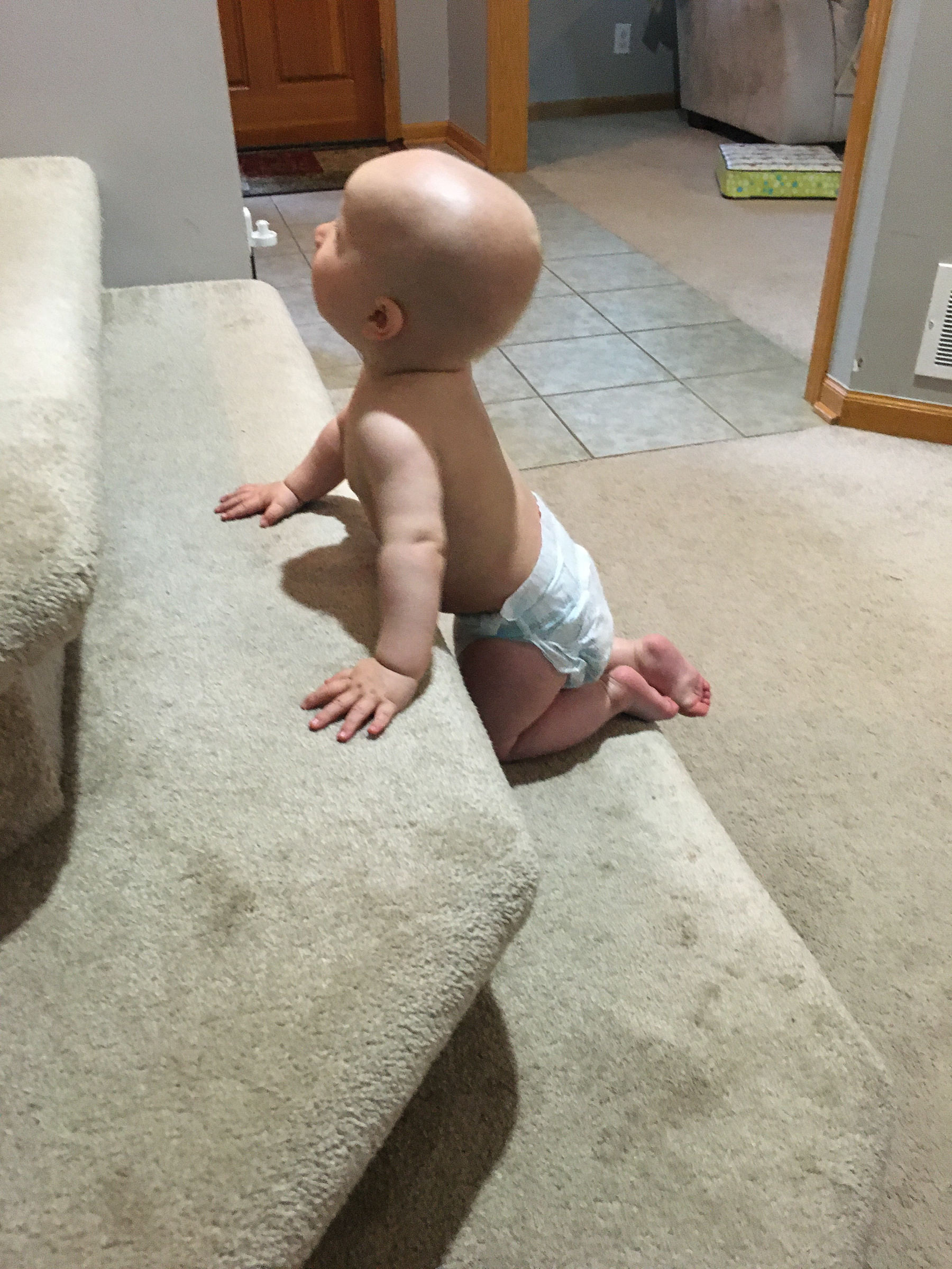 Well. Nothing else in the house is safe. You are determined to get moving as fast as possible. From the slowest of army crawls at the start of the month, you’re racing around on your tummy. Watching your cousin taught you to pull up, so it’s up on anything that’s low enough to grab from your stomach. Pulling up means you can get your knees up, which has led to climbing up the stairs. From the army crawl you’ve figured out that real crawling is actually faster, so you get up in a four-point stance and take off in the crawl. Last but not least, 6 months of watching the boys running around the house has you determined to get up on those feet and walk. We’re scrambling to baby-proof and dig out the baby gates. Fortunately, your brothers are on top of closing doors and plugging light sockets, so you should be ok.