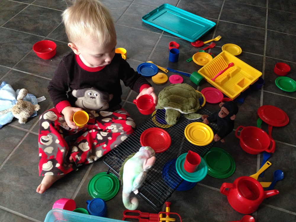 - “Dump it all out!” as you dumped an entire container of toy dishes on the kitchen floor. This quickly led to a tea party with your stuffed animals and lots of water. It’s ok. The tile can take it, but we won’t get to watch you do this for very long at all.