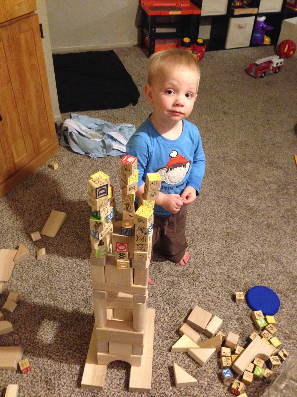 The same things have happened with your motor skills this month. You’ve been very focused on building towers with Daddy, which I can’t get enough of either. It’s bringing out your organizational side, which is so much fun to watch. You’re peeling your own fruit, making circles on your plate from Cheerios, and many other things that are just a joy to watch. Of course, new motor skills and you adventurous spirit brings many new rules we didn’t expect to need. “Seth, we do not ride the dog.” 30 seconds later, “Seth, we also do not tackle the dog.”