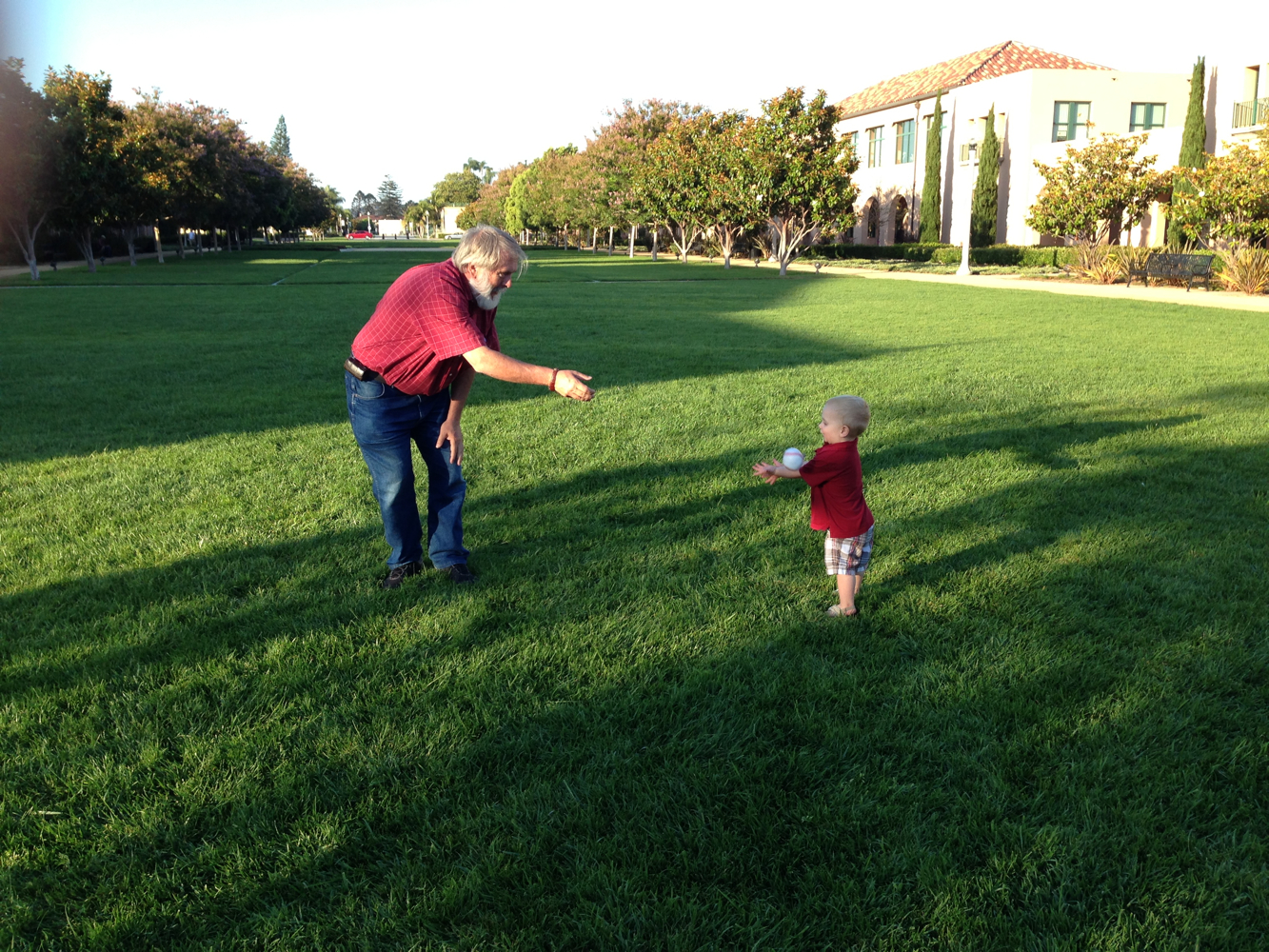 As convenient as it is to have two adults around who will jump at your requests, it’s still easier to get your cups of water out of Molly’s dish. “Immune system” we keep telling ourselves. I hope it’s true. As you do when Papa is visiting, you were constantly asking to drink out of his glass of juice. We were all sitting around, you with your sippy cup and Papa with his glass. He told you “no” to your request. Two minutes later as we were talking, we noticed that Papa now had the sippy cup and you had his juice glass, and we’re all completely unaware of when the switch happened. Good times – that’s why it’s fun to be your parents, but it’s fun to be your grandparents, too.