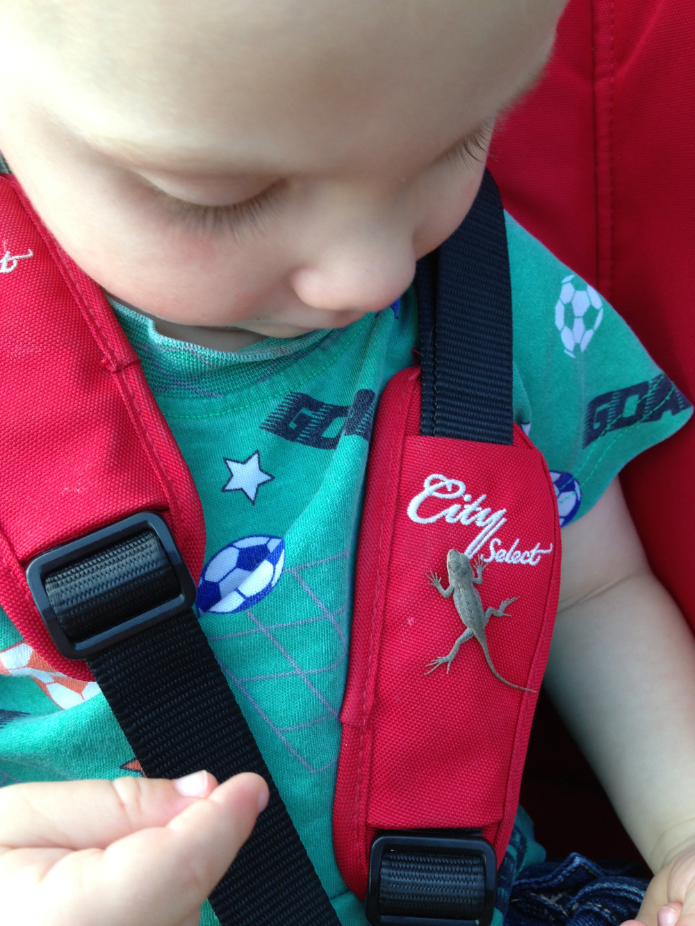 Close encounters with wildlife this month, too. We’ve been walking by lizards for months as we walk in the neighborhood, Daddy managed to catch one and you asked to touch it, as you do. I tried to pass it off to you to hold, and it jumped out of my hand, into the stroller, and promptly crawled into your shorts. Fortunately, Daddy and Mommy were laughing, so you thought it was pretty hilarious. We had to unbuckle you and dig the lizard out of your shorts, where it was holding on for dear life. All boy, you now ask to hold every lizard we walk by.